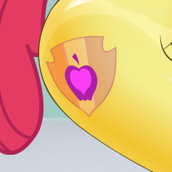 Apple Bloom's real cutie mark as of Series 5, Episode 18 and later. I've made the background of the shield more transparent to allow the individual part to stand out more, not an uncommon tweak in fanart TBH.
