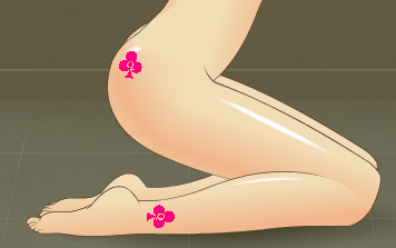RGB adjustable tattoos of the four card suits on her arm, breast, ankle, and butt.