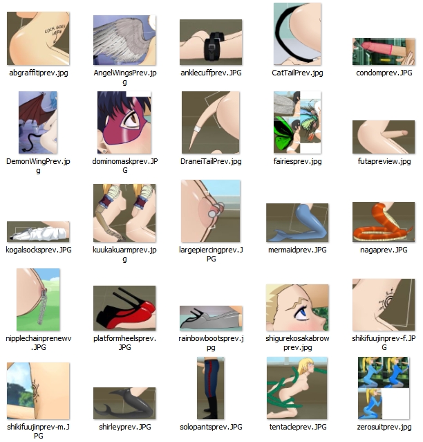 Ab Graffiti, Angel Wings, Ankle Cuff, Cat Tail, Condom, Demon Wing, Domino Mask, Dranei Tail, Fairy Wings, Futa, Kogal Socks, Kuukaku Arm, Large Nipple Piercing, Mermaid Tail, Naga Tail, Nipple Chain, Platform Heels, Rainbow Boots, Shigure Kosaka Eyebrows, Shiki Fuujin Tats for Male and Female, Shirley (Shark Tail), Han Solo Pants (Star Wars), Tentacles, Samus Zero Suit (Metroid)