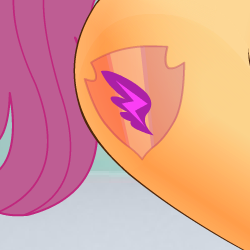 G4 Scootaloo's real cutie mark as of Series 5, Episode 18 and later. I've made the background of the shield more transparent to allow the individual part to stand out more, not an uncommon tweak in fanart TBH.
