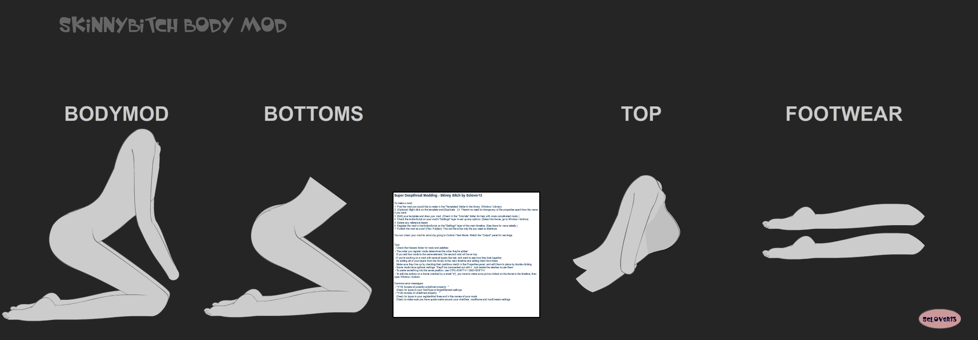 Currently only the light skin mod is available. This will be updated in the near future. This modding tool should help any modder who would like to design clothing or costumes for SkinnyBitch body mod.