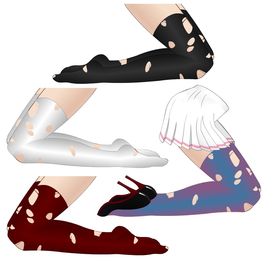 Torn Stockings (RGB shiftable): will not collide with Bottom and Legwear mods, but is affected by Skin Tint HSL sliders.