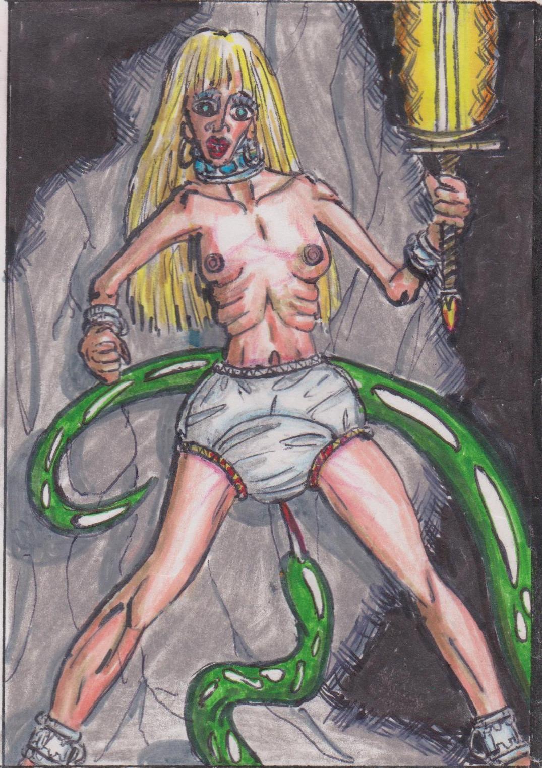 Kiri falls into the grip of a deep dungeon-dwelling tentamort. Underclad in her standard dungeon dress, her helplessness is absolute. The acidic stinger will pierce the crotch of her white plastic briefs, reducing her genitals to a bloody pulp, to be siphoned up the tentacle via nauseating suction.