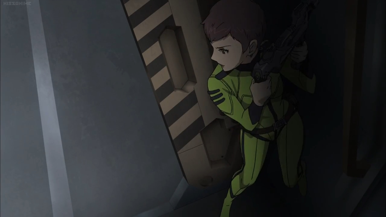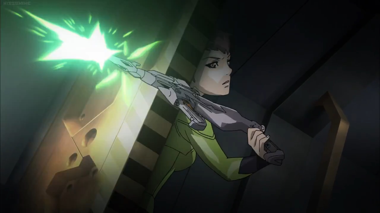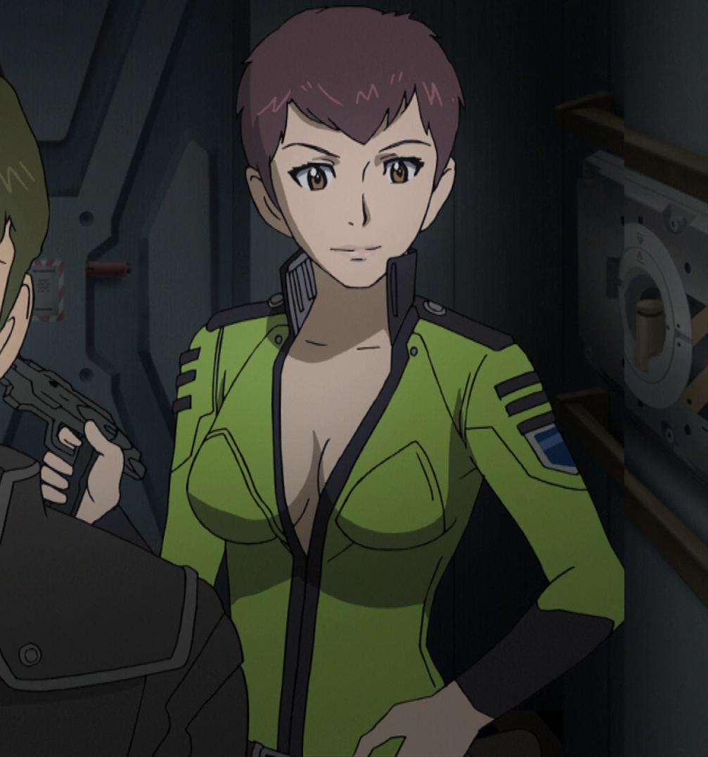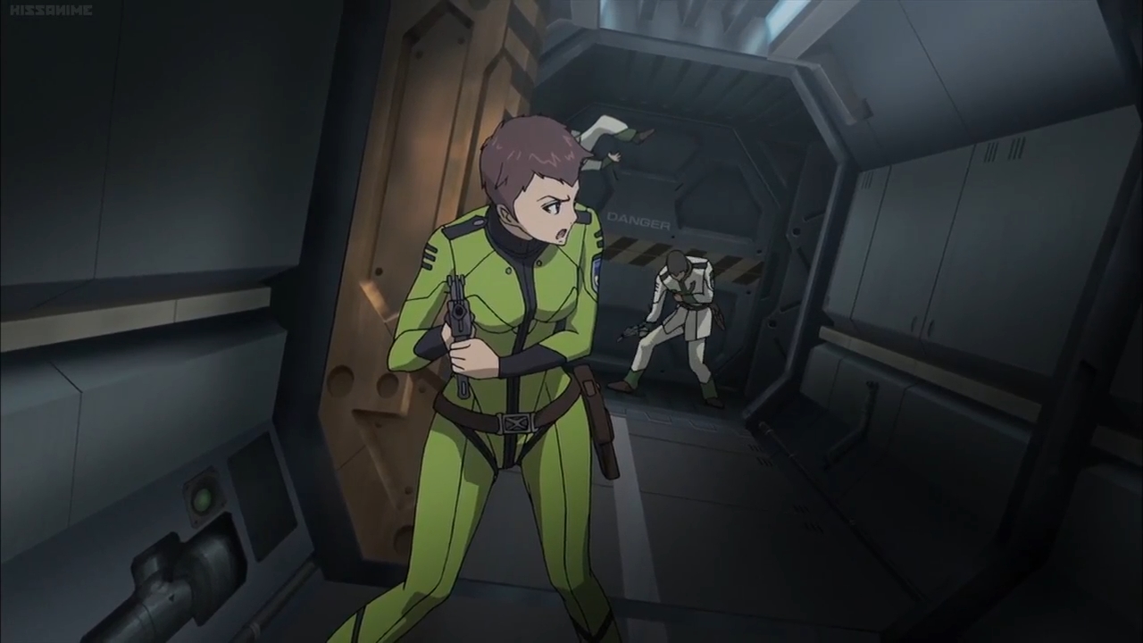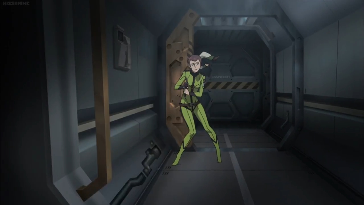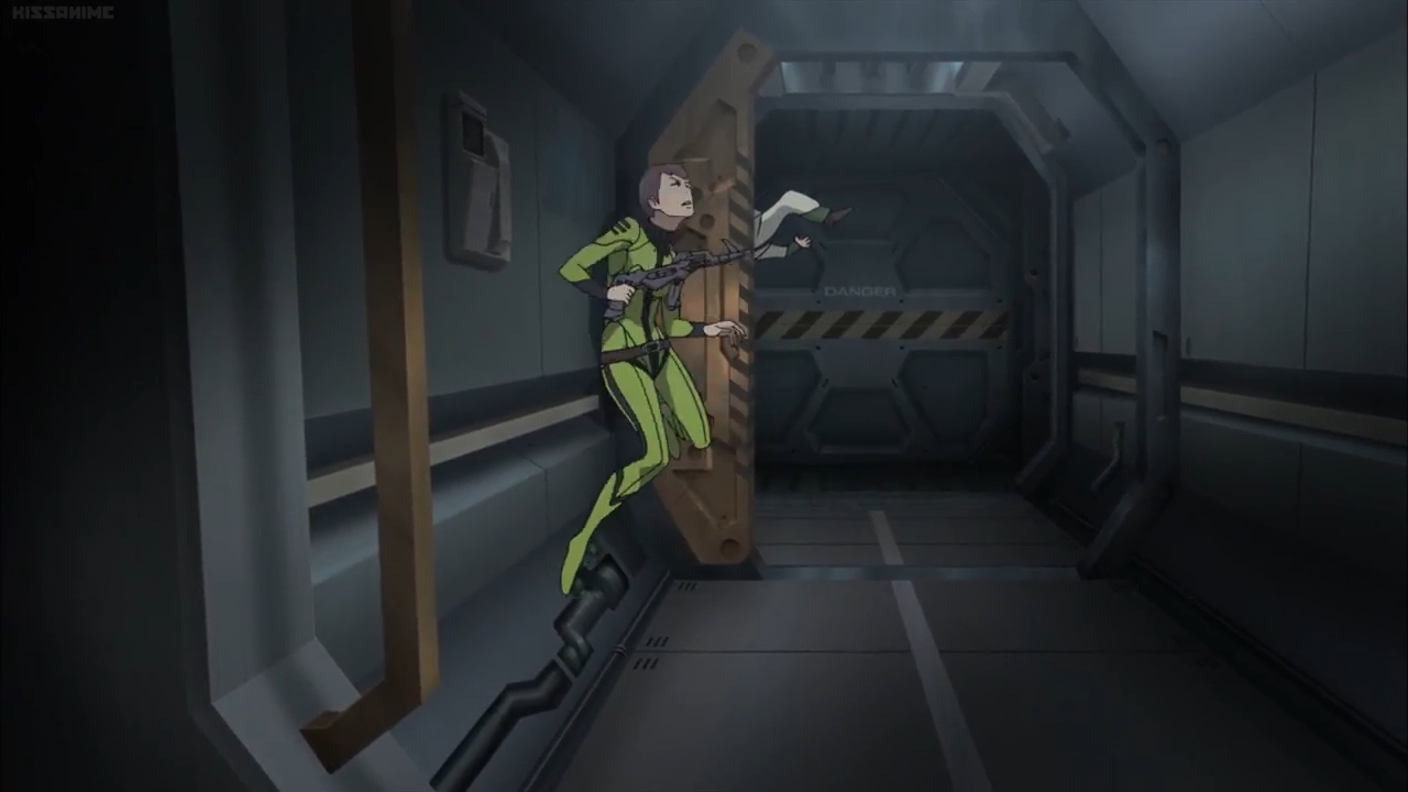 Here, did some more screencaps of her. She is never named, only the surviving guy on the team (whom she teases in a scene) was named. When they accidentally bumped into the space princess (or rather a human who for some never explained reason looks exactly like her... man, anime are often so weird) she knocks her out with... chloroform, I guess? She got shot in zero-G with a machine gun after killing quite a few humans, dying instantly, her corpse floating in the corridor.