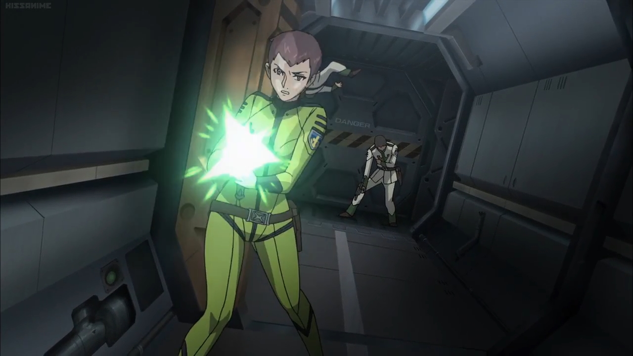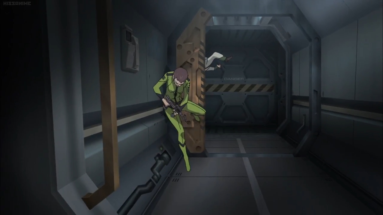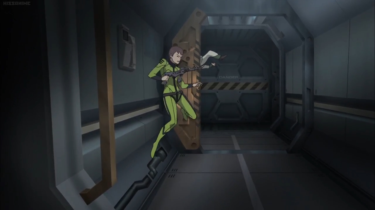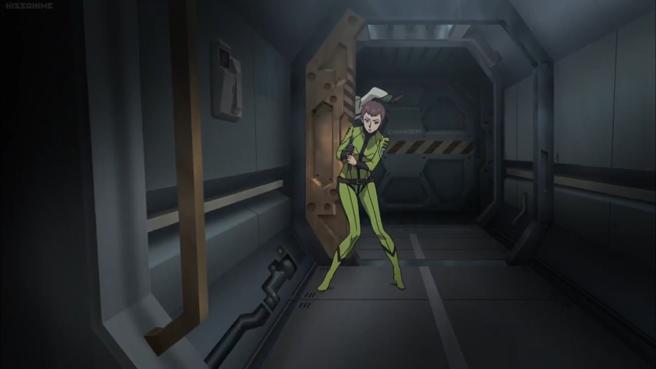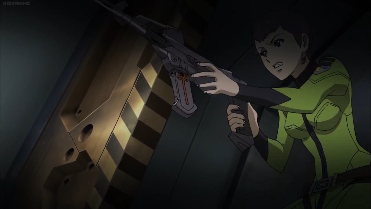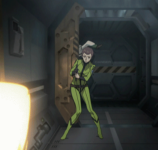Here, did some more screencaps of her. She is never named, only the surviving guy on the team (whom she teases in a scene) was named. When they accidentally bumped into the space princess (or rather a human who for some never explained reason looks exactly like her... man, anime are often so weird) she knocks her out with... chloroform, I guess? She got shot in zero-G with a machine gun after killing quite a few humans, dying instantly, her corpse floating in the corridor.