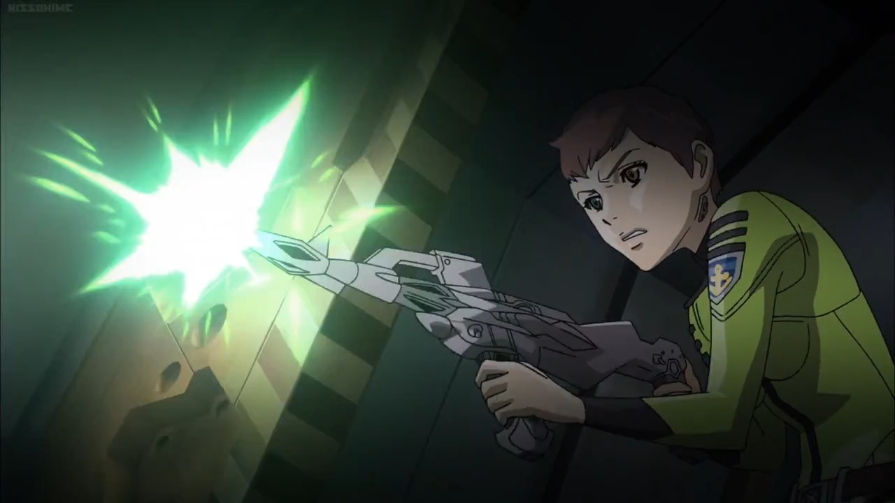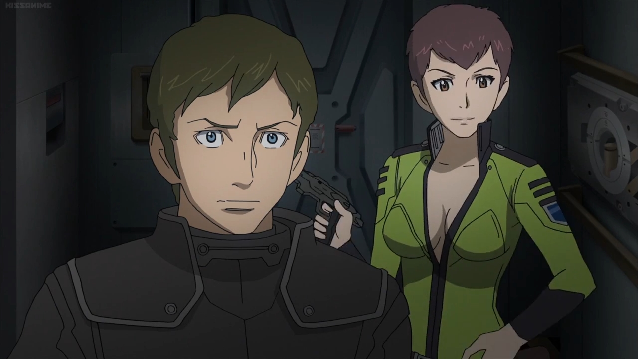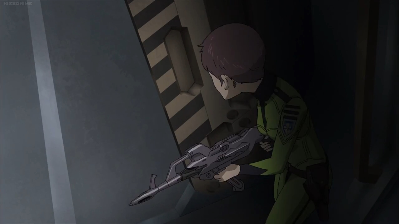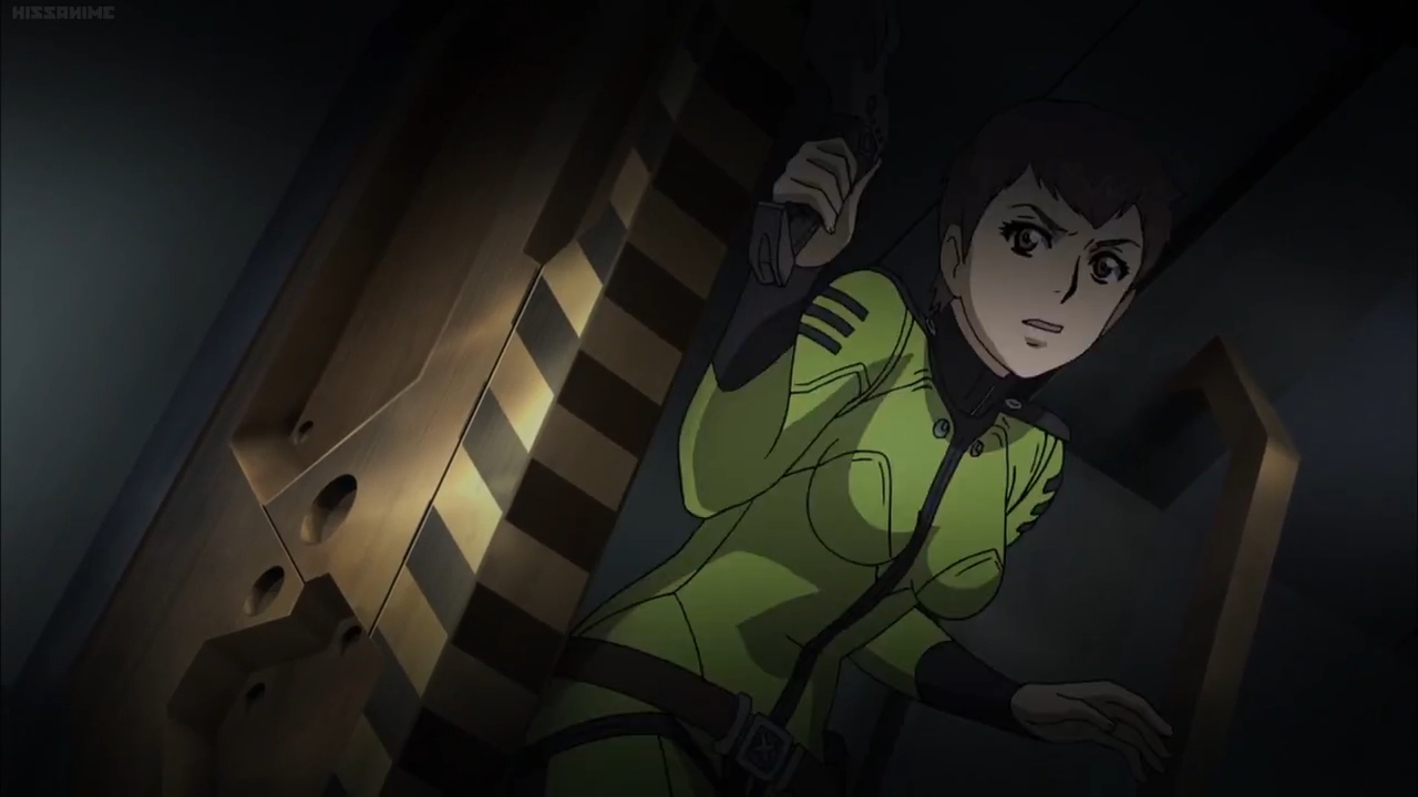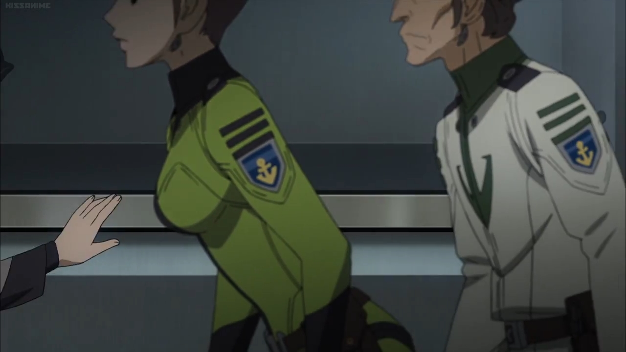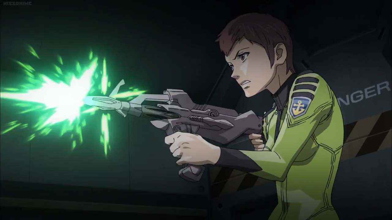 Here, did some more screencaps of her. She is never named, only the surviving guy on the team (whom she teases in a scene) was named. When they accidentally bumped into the space princess (or rather a human who for some never explained reason looks exactly like her... man, anime are often so weird) she knocks her out with... chloroform, I guess? She got shot in zero-G with a machine gun after killing quite a few humans, dying instantly, her corpse floating in the corridor.
