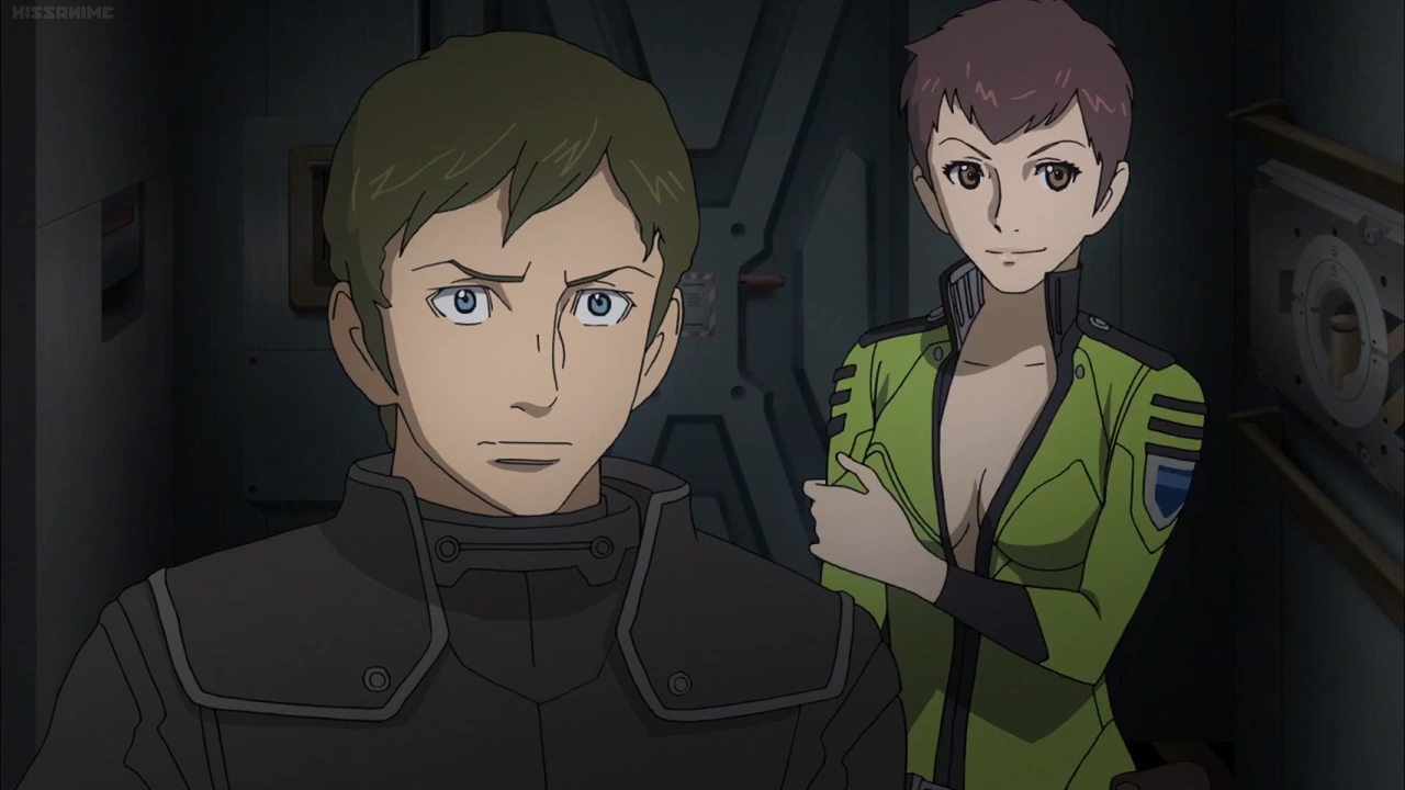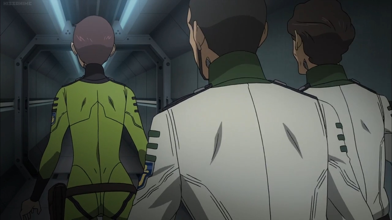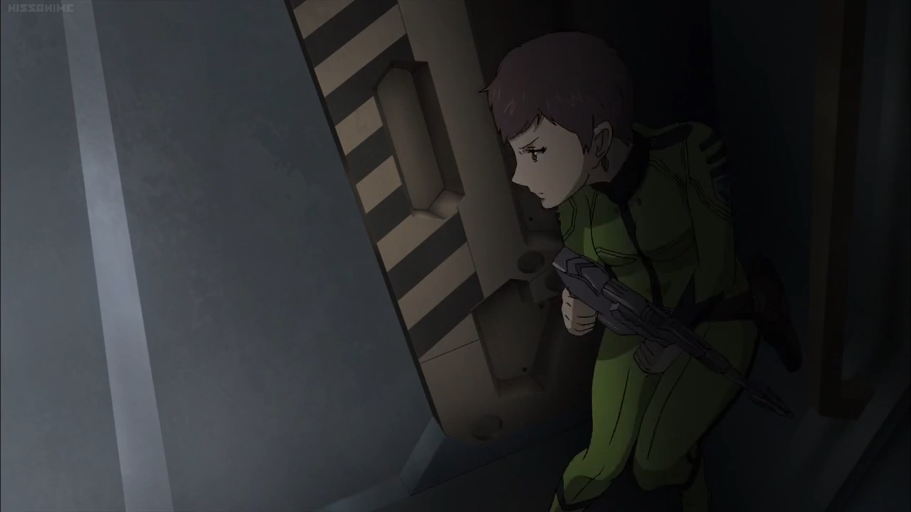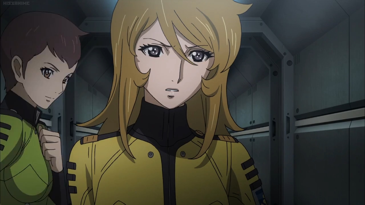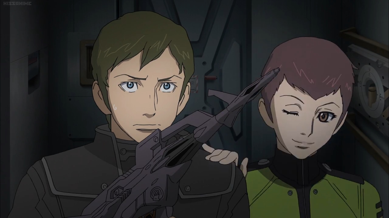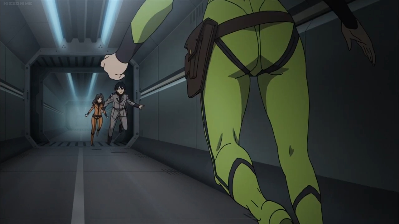 Here, did some more screencaps of her. She is never named, only the surviving guy on the team (whom she teases in a scene) was named. When they accidentally bumped into the space princess (or rather a human who for some never explained reason looks exactly like her... man, anime are often so weird) she knocks her out with... chloroform, I guess? She got shot in zero-G with a machine gun after killing quite a few humans, dying instantly, her corpse floating in the corridor.