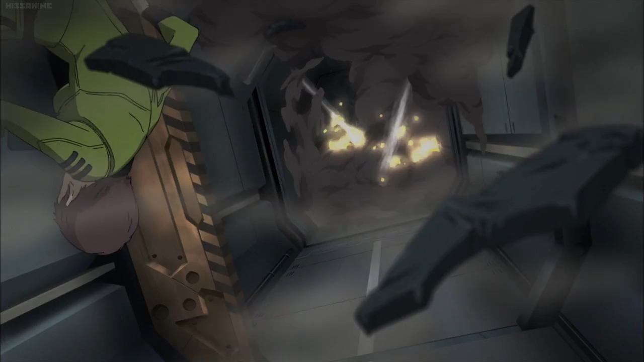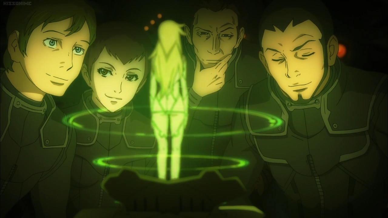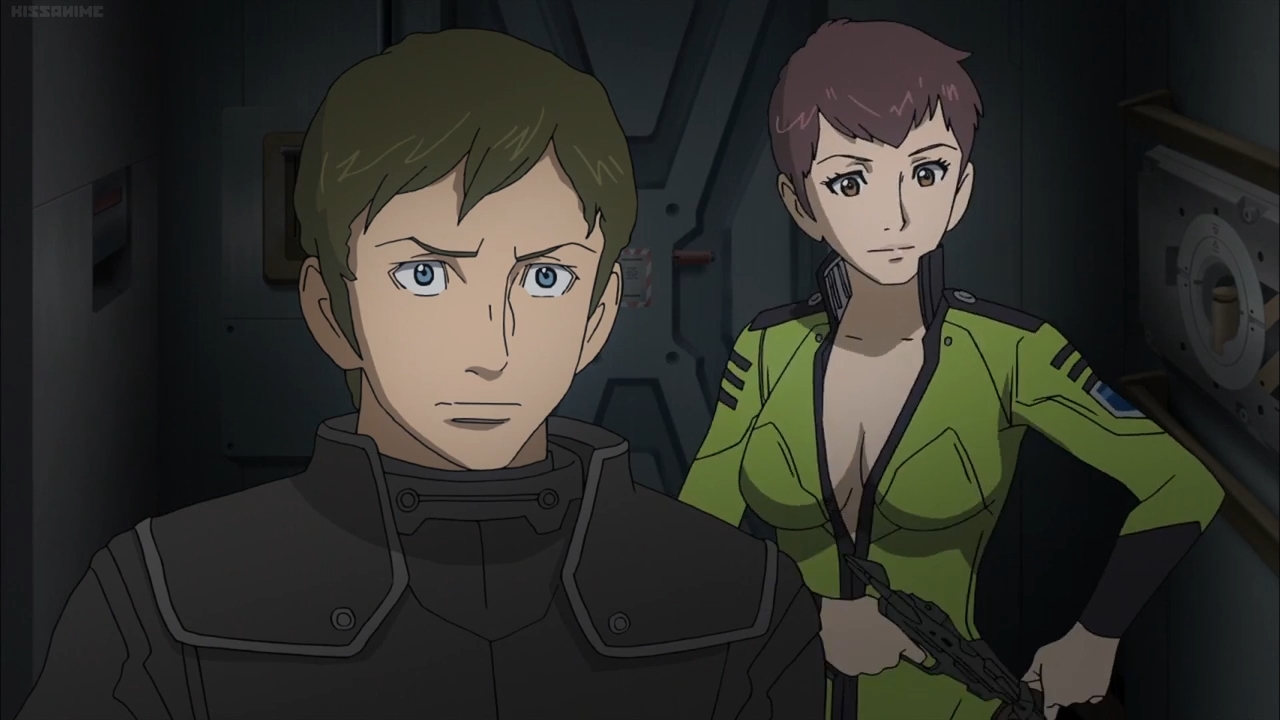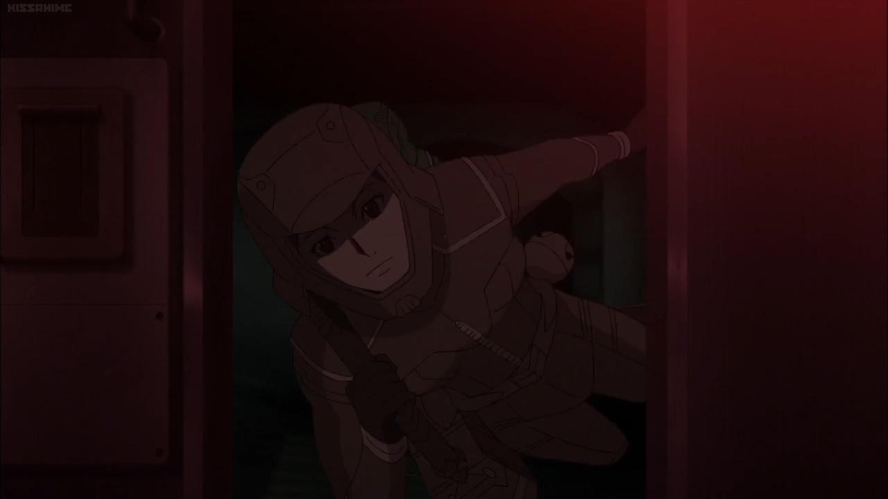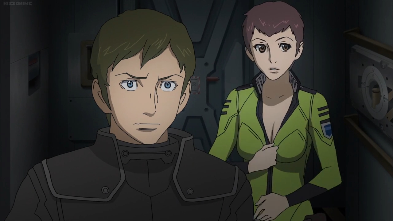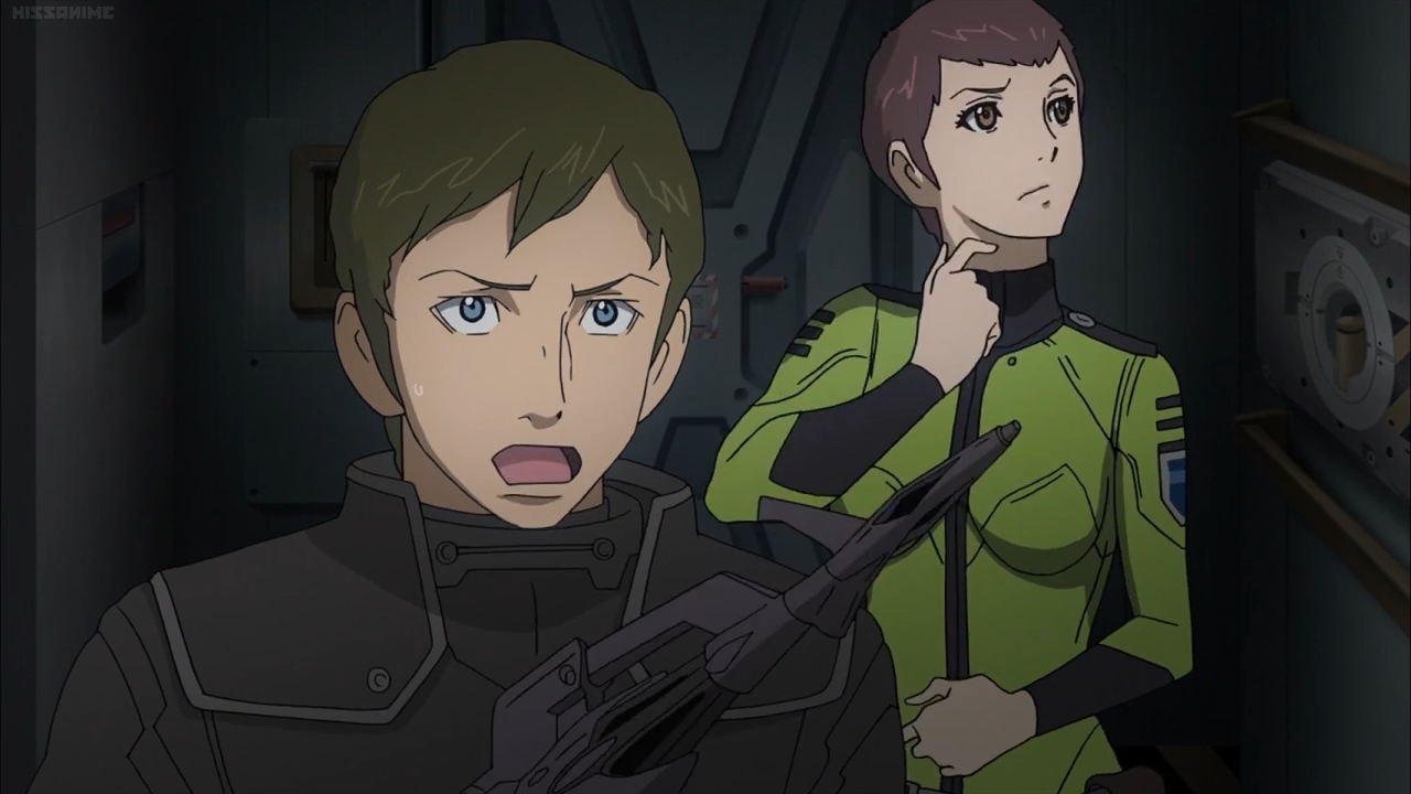 Here, did some more screencaps of her. She is never named, only the surviving guy on the team (whom she teases in a scene) was named. When they accidentally bumped into the space princess (or rather a human who for some never explained reason looks exactly like her... man, anime are often so weird) she knocks her out with... chloroform, I guess? She got shot in zero-G with a machine gun after killing quite a few humans, dying instantly, her corpse floating in the corridor.