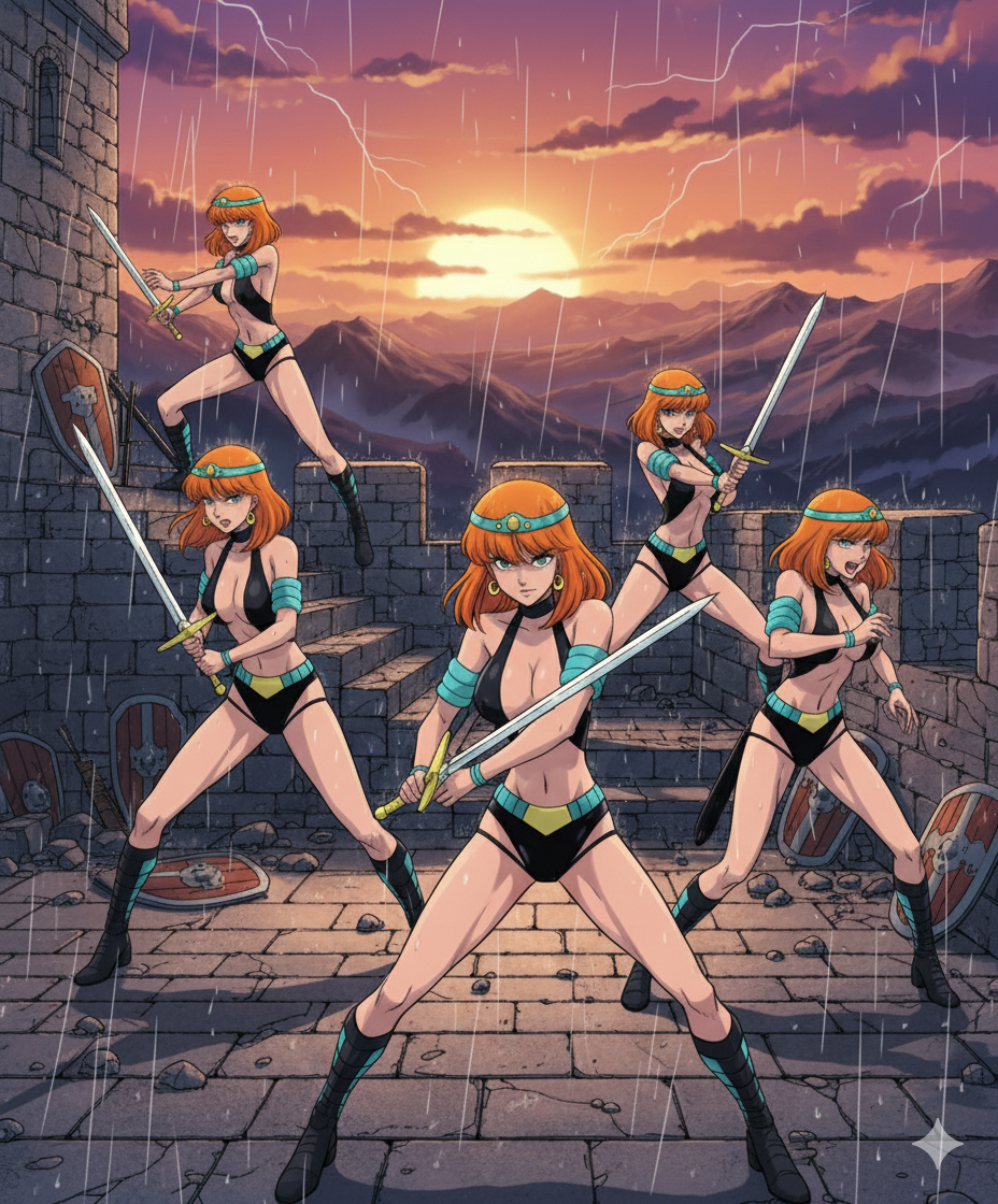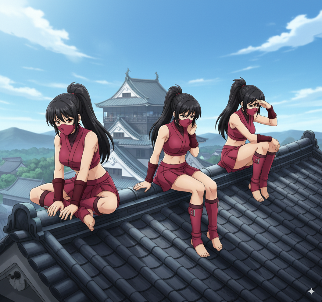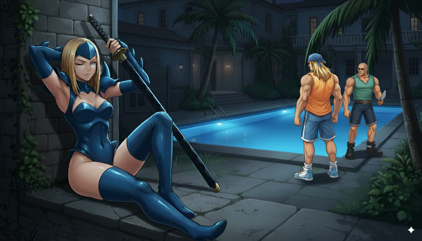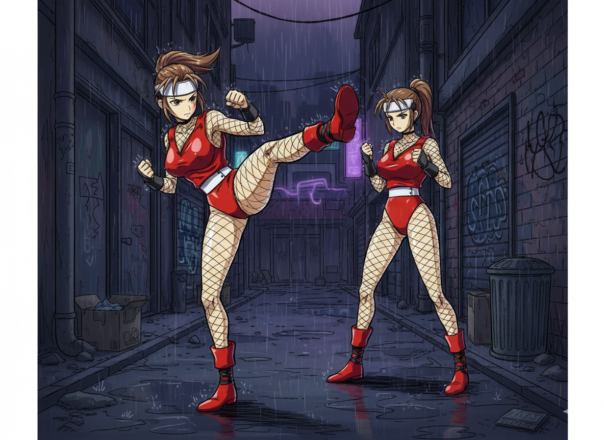 Google AI been cooking with the poses lately, for those who are interested, I feed it with the kunoichi image, the bad dudes protagonist, the following image for pose reference: