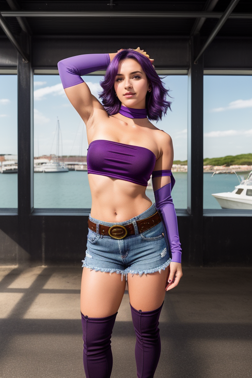 a beautiful girl with medium hair, purple hair, (purple strapless tube top), (arm sleeves:1.5), strapless, cleavage, full body, large breast, midriff, purple denim shorts, belt, standing in a harbor, black socks, sneakers, sea view , looking at viewer, 24mm, 4k textures, soft cinematic light
