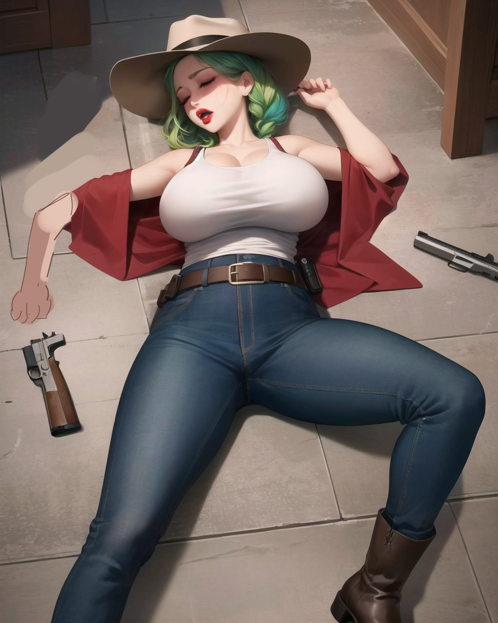 Her bare foot for example, was one of the hardest parts as she originally had a boot on her foot too, despite having a boot lying in the corner. I wanted to make it appear as that boot slipped form her foot as she fell down. It was so hard to remove the boot from her foot and make a plausible looking bare foot in its place, that it took nearly 50+ hires image generations, multiple prompts and mask variations, and lot of time.