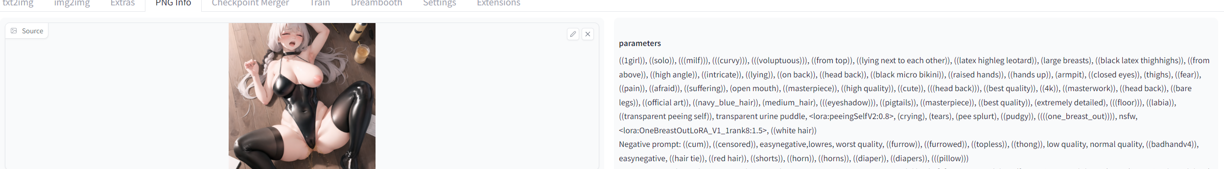 Second, you can just generate something, roughly edit it in photoshop or mspaint or wherever and then use Inpaint subtool in img2img with Denoising Strength value at ~0.5-0.6 on the photoshopped area. It usually takes 3-4 generations to make something decent. It also usually has some minor mistakes but then you can send the generation you liked to inpaint again and just inpaint the smaller areas until you get what you like. It doesn't really take that much time. And then you can also add the usual R-18G zako stuff like wounds or pee by adding specific LORAs and prompts to the inpaint and switching models in the process.