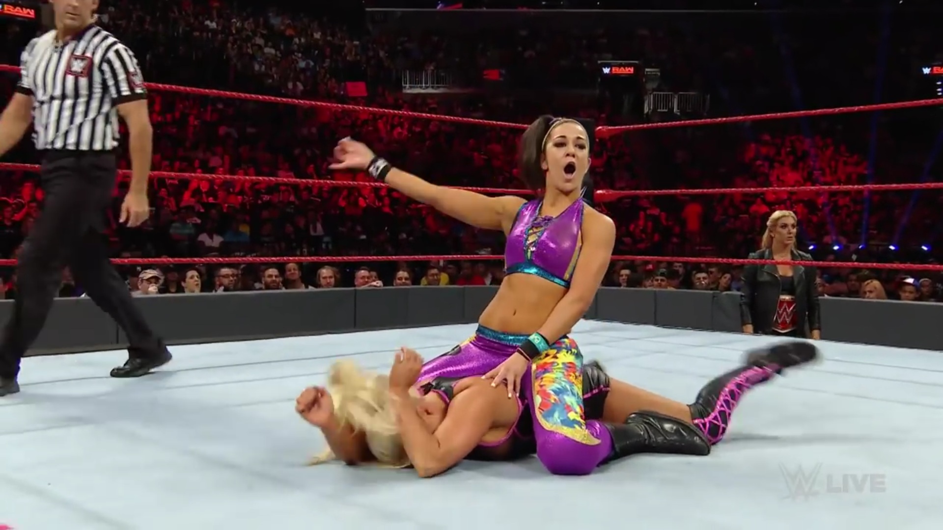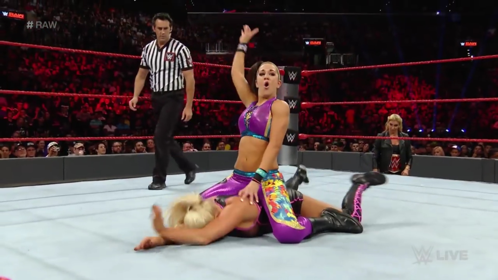 "Too easy!" Eva bragged with her hands on her hips. She slid back into the ring and gloated even more, letting Stephanie begin her count at last. By the time she reached eight though, AJ was still nearly motionless, so she stopped short.