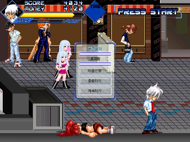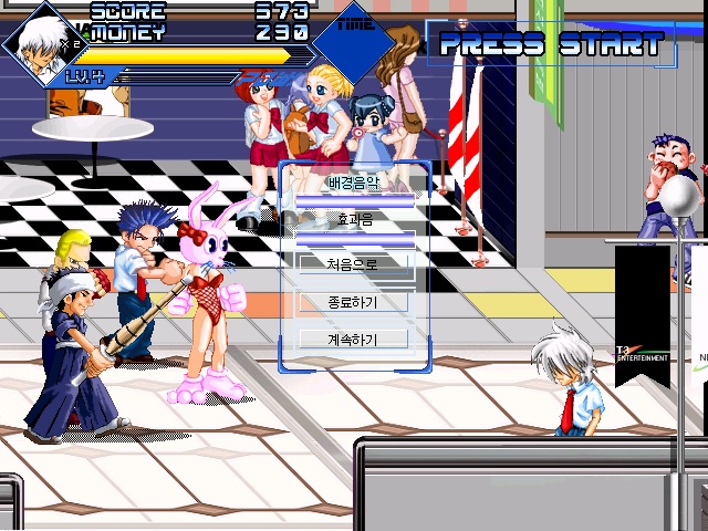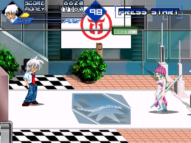 Jjang has more than one female enemy: girl with baton and woman dressed in rabbit costume. You also fight a female boss near the end of the game. This game was so difficult to grab screenshots because anything that takes you out of the game crashes it. I had to play the entire game just for one screenshot and then do it again for another.Another Korean beat em up, It got a similar looking zako, a chick with skimpy purple outfit, black boots and platinum blonde hair.