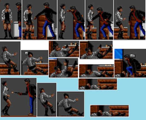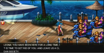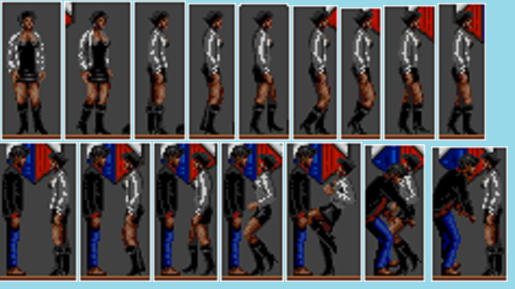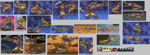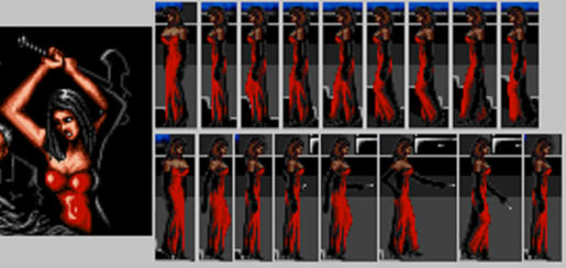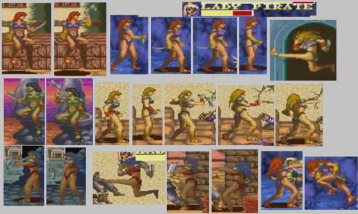 Much like the game itself, the "pirate lady" seems unfinished. She can perform a few attacks, like jumping kicks and slashing with her knives, but that's it. Even worse, the designers recycled the same "hurt" animation for every attack. She reacts the same way to a sword slash as to being grappled and kneed in the stomach or thrown through the air. In fact, she shows no reaction at all between being grappled and being kneed/headbutted, because her single "hurt" sprite is used for all of these situations. When defeated, she gives the blandest "scream" I've ever encountered.