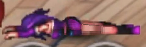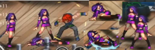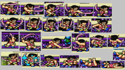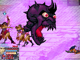 This female demon has pointy ears, wields two swords, and wears what seems to be a pink leotard. I like the change in her facial expression from confidence to dismay when she is knocked down, but that is the biggest positive I see. She cannot do much except swing her swords and jump, and the heroes can only perform their basic attack on her. There are no throws or grapples between them. She can be attacked while she is down, but her sprite does not change. She can also be knocked off the edge of the platforms.