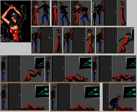 Let's wrap this post up with two old-school but still good zako. In Dylan Dog: The Murderers, the hero is a detective whose main skill seems to be fighting. He is investigating a mansion where nearly everyone seems to be an enemy, including a large number of fancy ladies wearing red dresses and party chicks wearing short skirts. He deals with these zako using either his fists, a knife, or a gun, depending on the player's preferences. Interestingly, defeated enemies do not disappear as in most games, but instead remain in place for the rest of the game. Because there is a lot of backtracking in this game, the hero walks by or over defeated zako many times.
