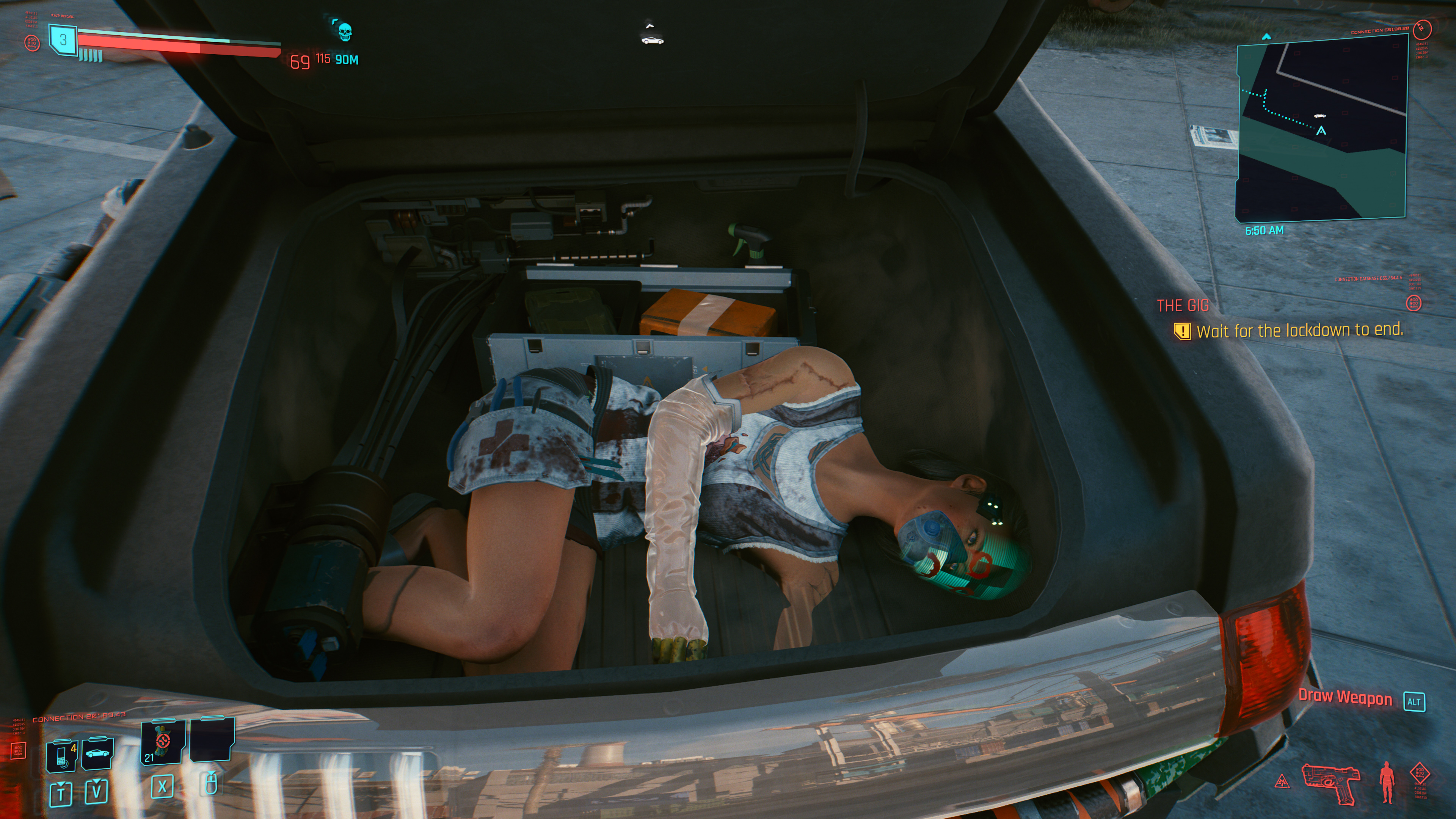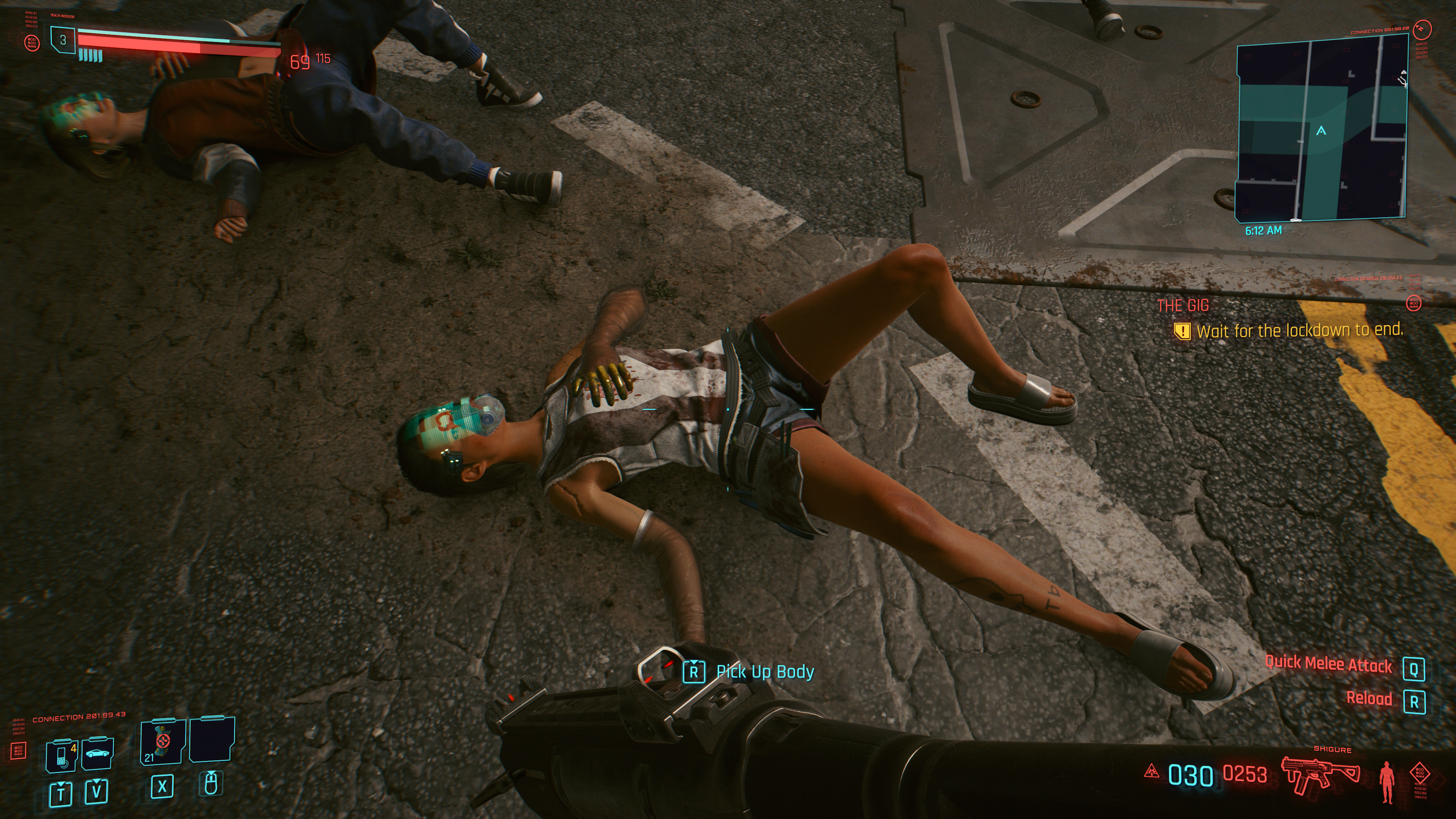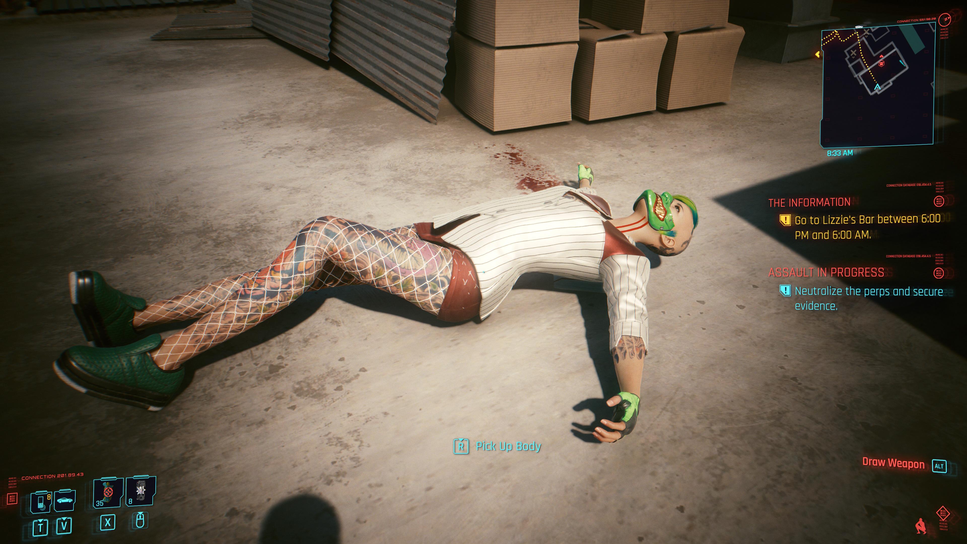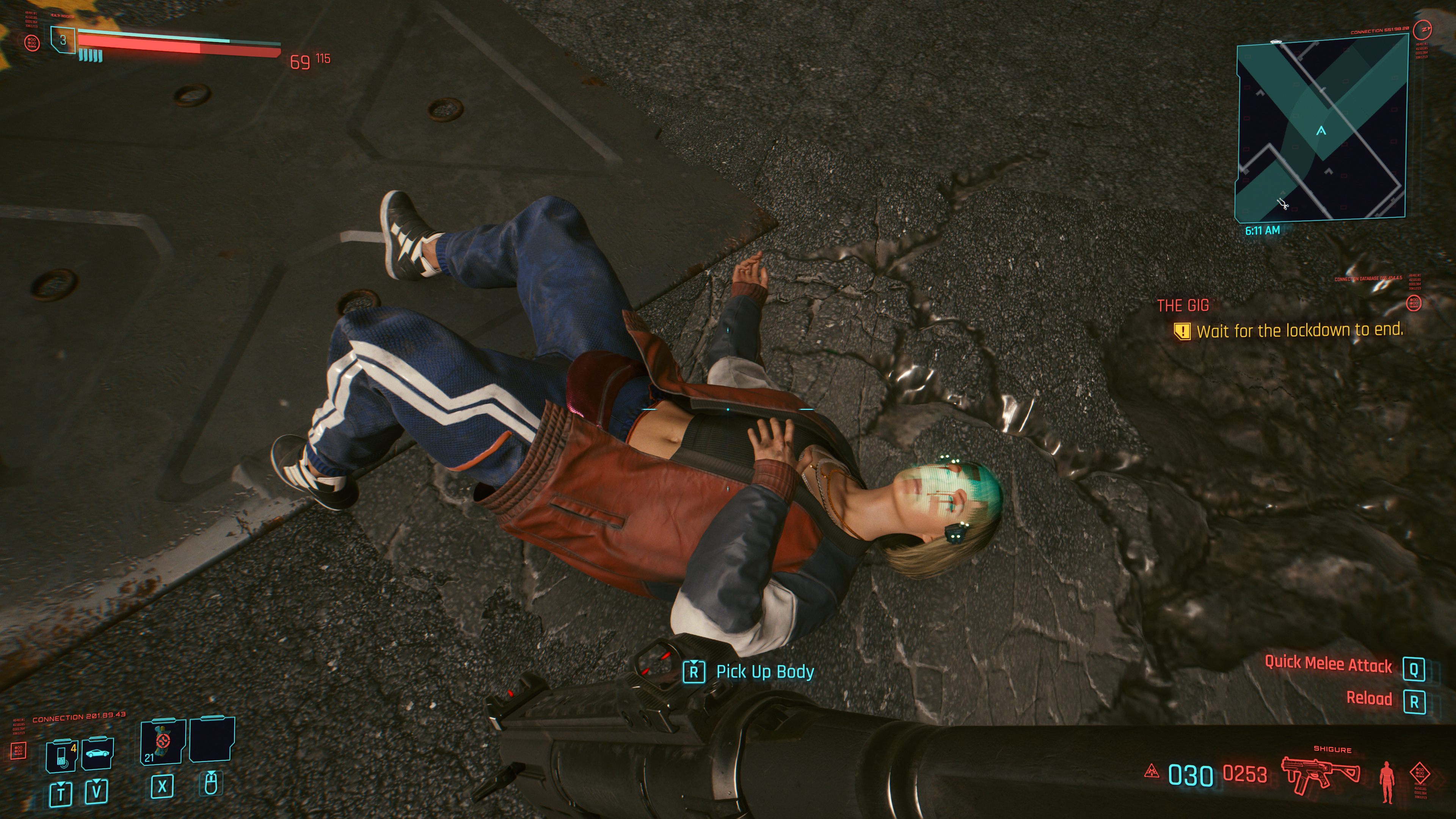 Cyberpunk 2077 Gameplay mechanics similar to Hitman in first person, you can grab them from behind and stealthy kill of knock the enemy out. you can carry the body and stash them into dumpster, inside the van or in the trunk of you car. You can injure the enemy, leaving a "hurt animation"