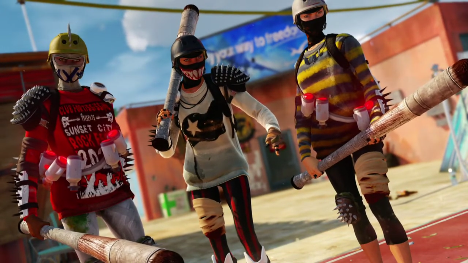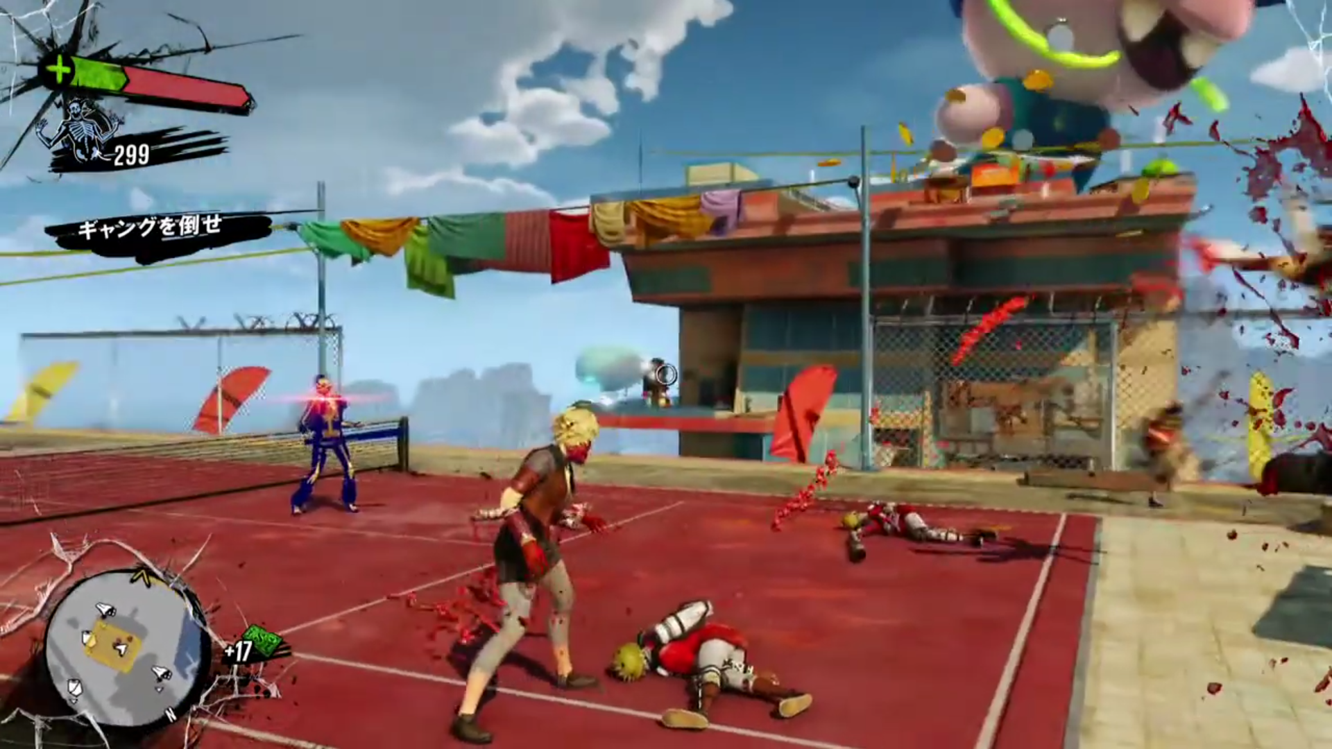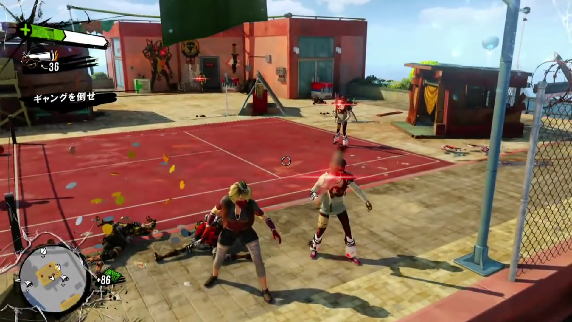 Here's an Xbox One launch title, it's called Sunset Overdrive. It's a third person melee skating combat game. You fight people that have turned into funny monsters after drinking a tainted engery drink(it's supposed to be a over the top humorous game) In this mission you're on a rooftop fighting a group of human women.