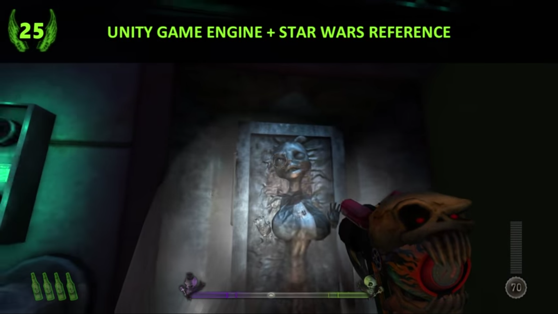 Here's an old one. It's a 3rd person shooter on the X360/Ps3 called Eat Lead: The return of Matt Hazard. It's another comedic game about a video game character(he's self aware), playing through various games. The game parodies other popular games of that time. In one level you fight a man that coded an army of women to service his mansion.