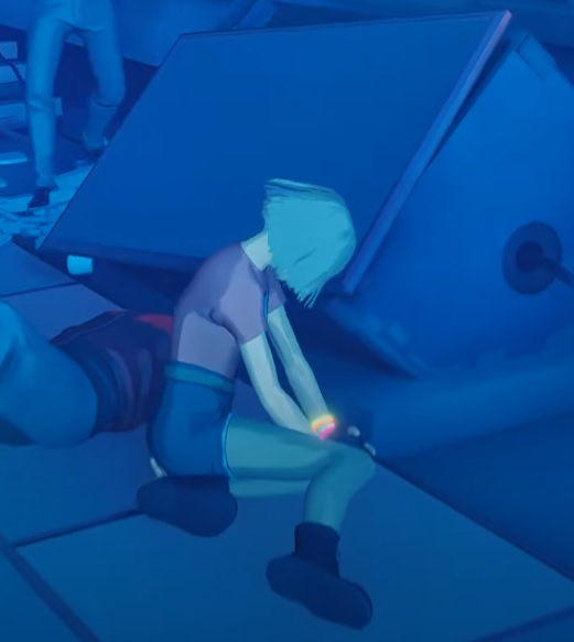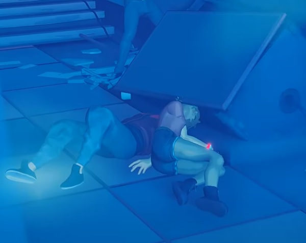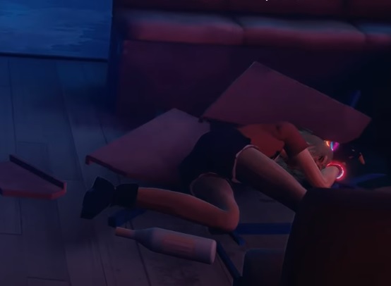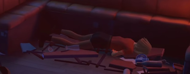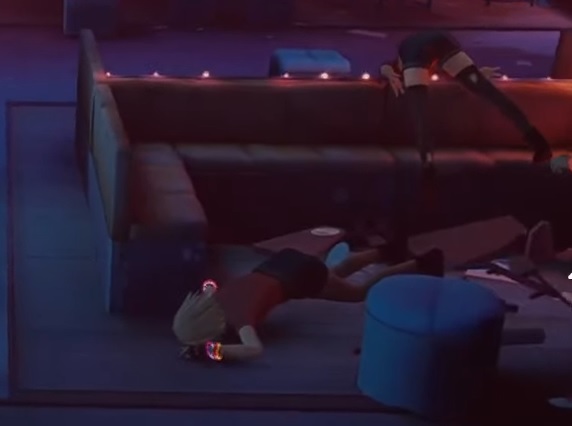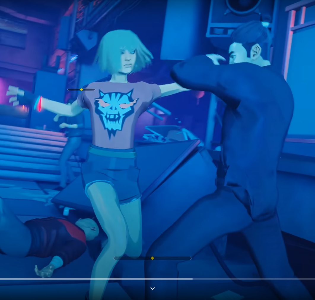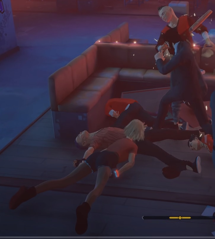 In the gameplay videos I've watched, the hero tends to target her first and to attack with a bat. The first blow often sends her party shades flying. The final blow leaves her either collapsed amidst the pieces of a destroyed table or partially buried beneath those pieces.