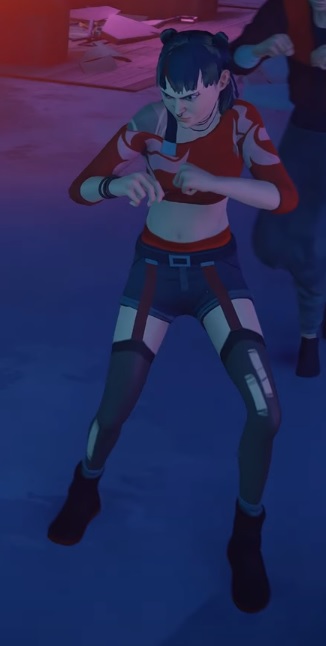 She reminds me somewhat of Soozie / Garnet from the Streets of Rage series: a blonde party girl wearing shorts over leggings.