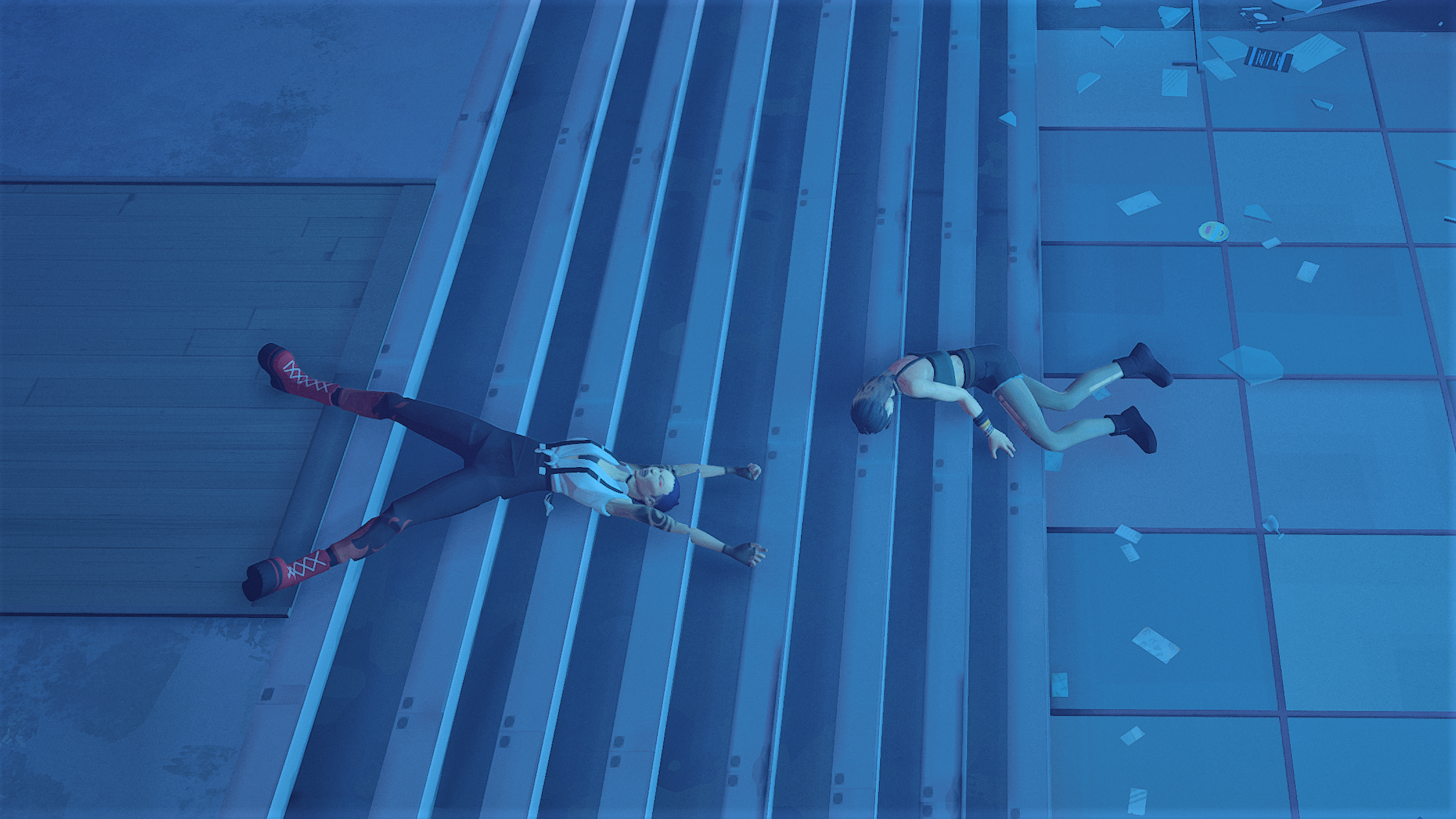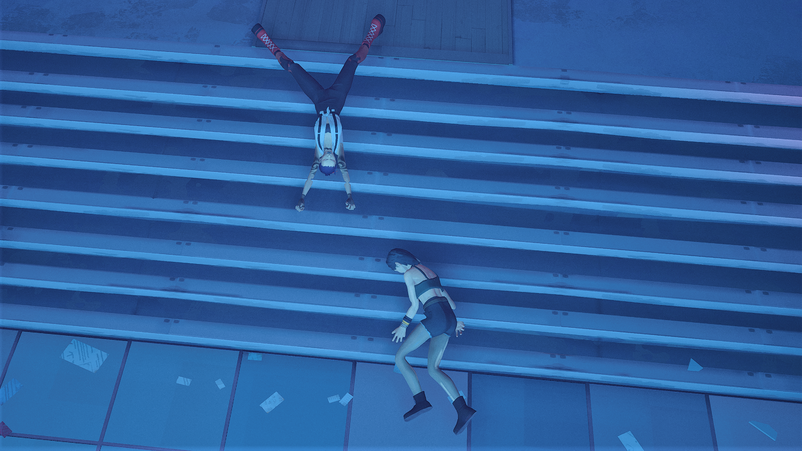 Under Sean's command, the hirelings begin dragging limp bodies behind locked doors, sweeping up broken glass, and setting things back in order. There are defeated zako lying around everywhere, like these two glimpsed from the second floor balcony: