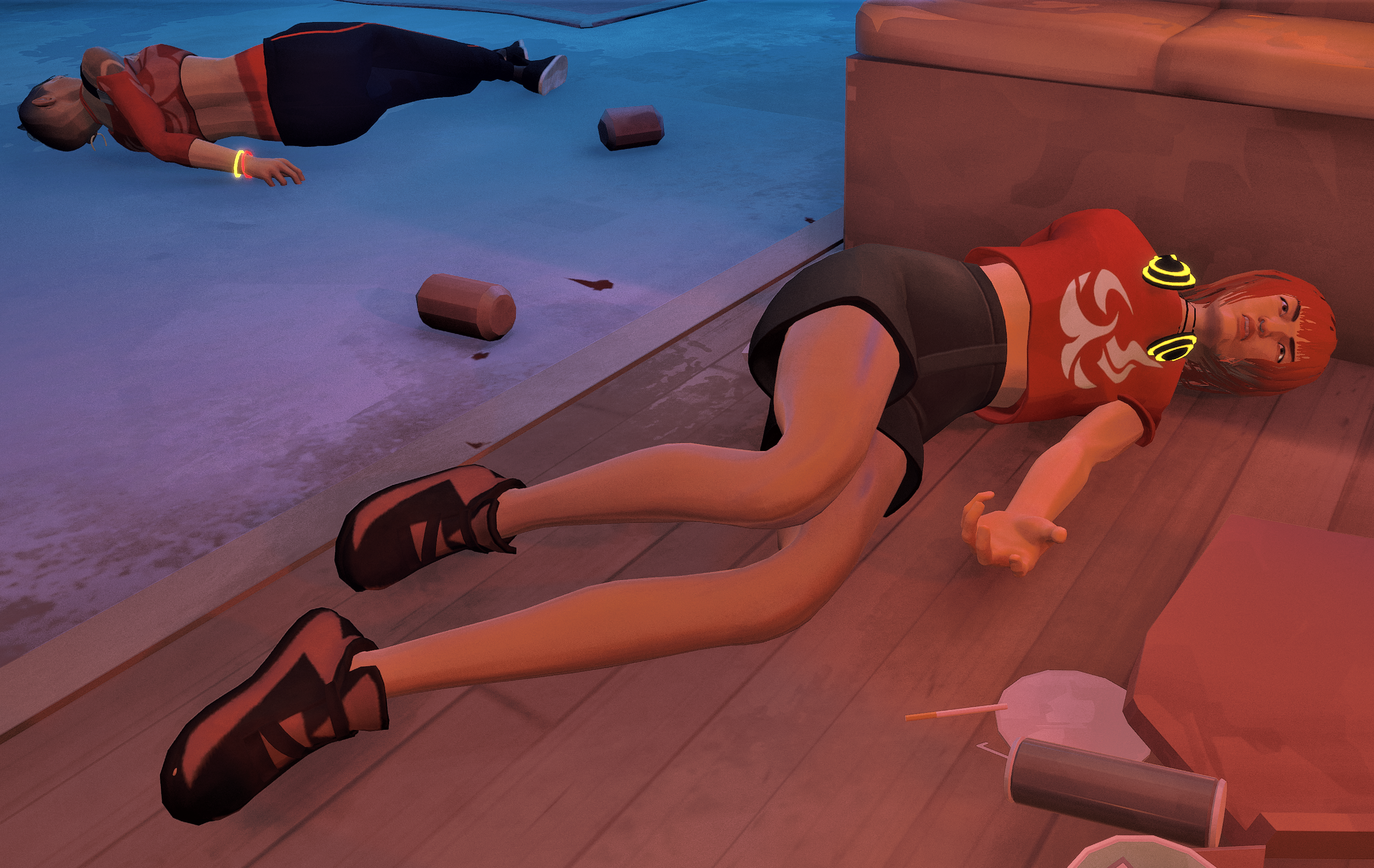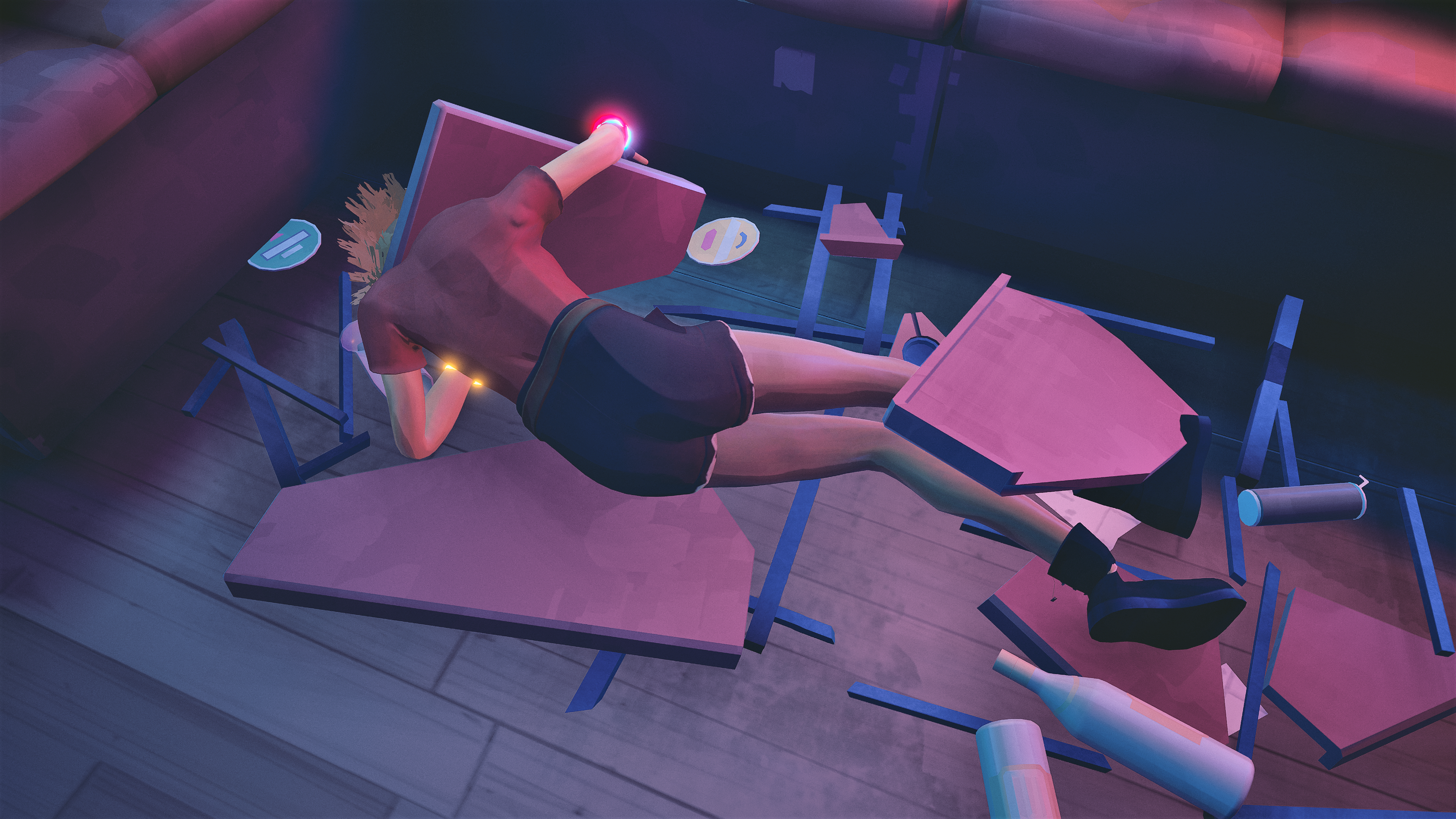 Maybe some of the later clubgoers will try to lift her back up to the couch, only to laugh as she keeps sliding back down to the floor: