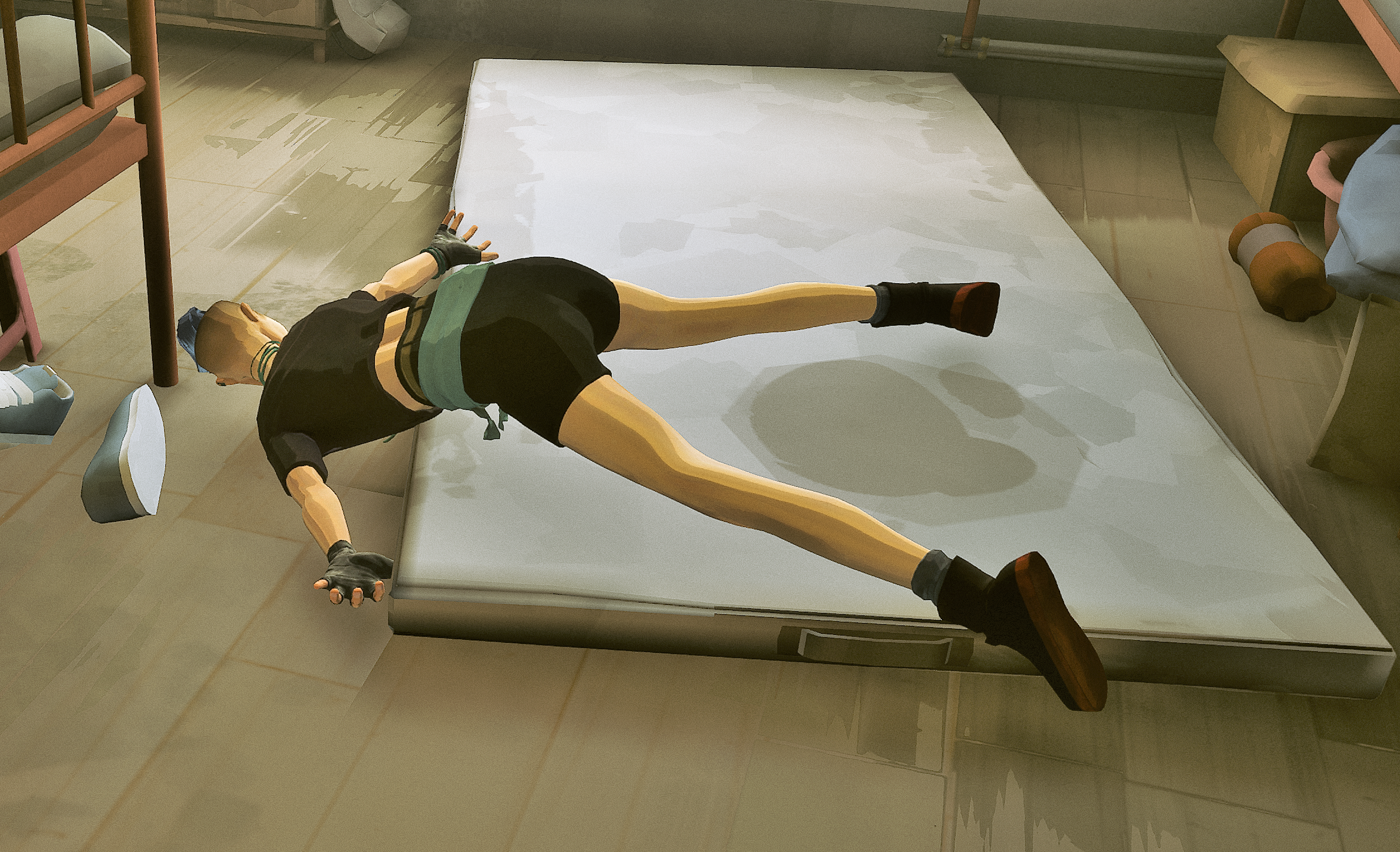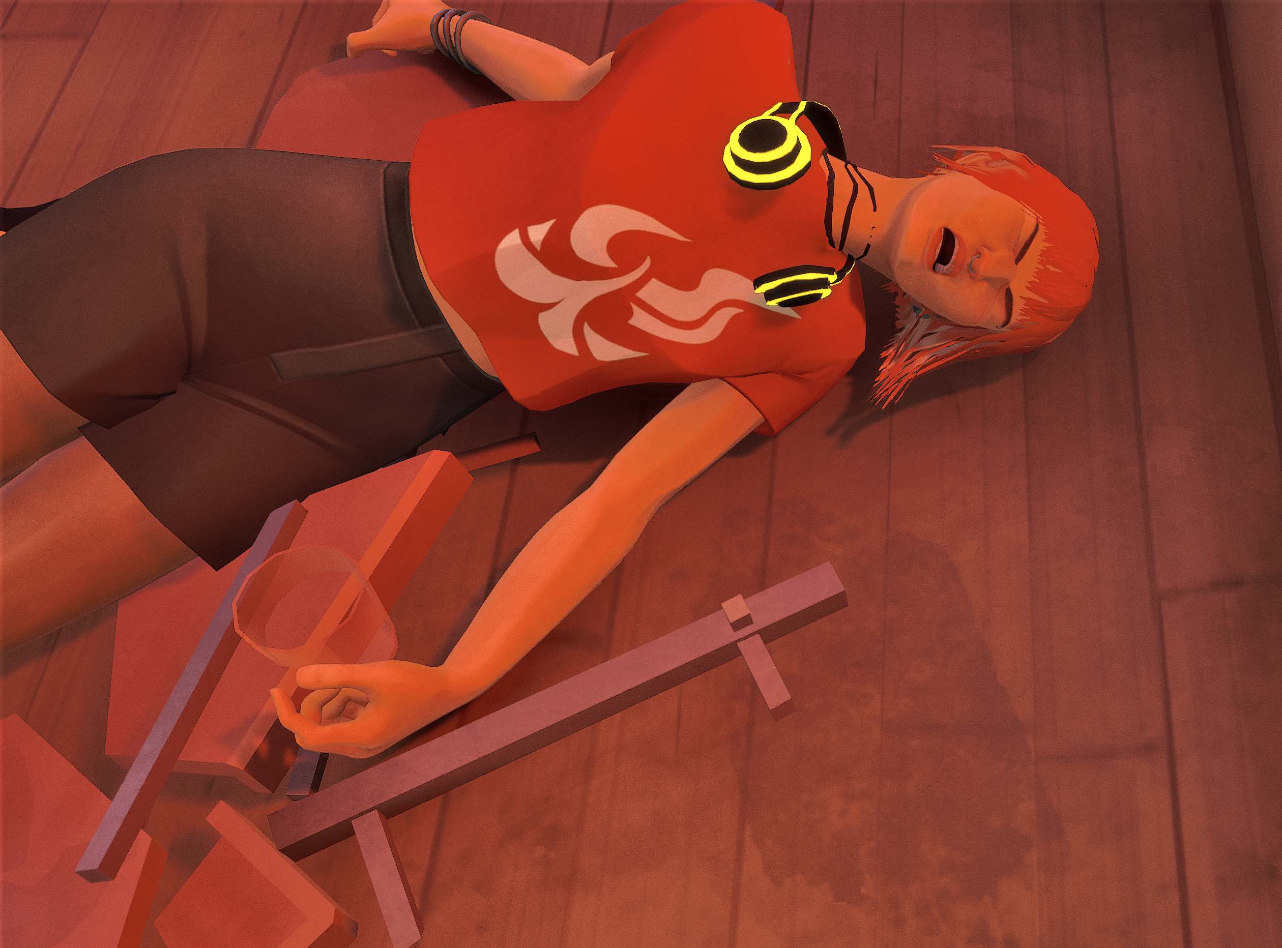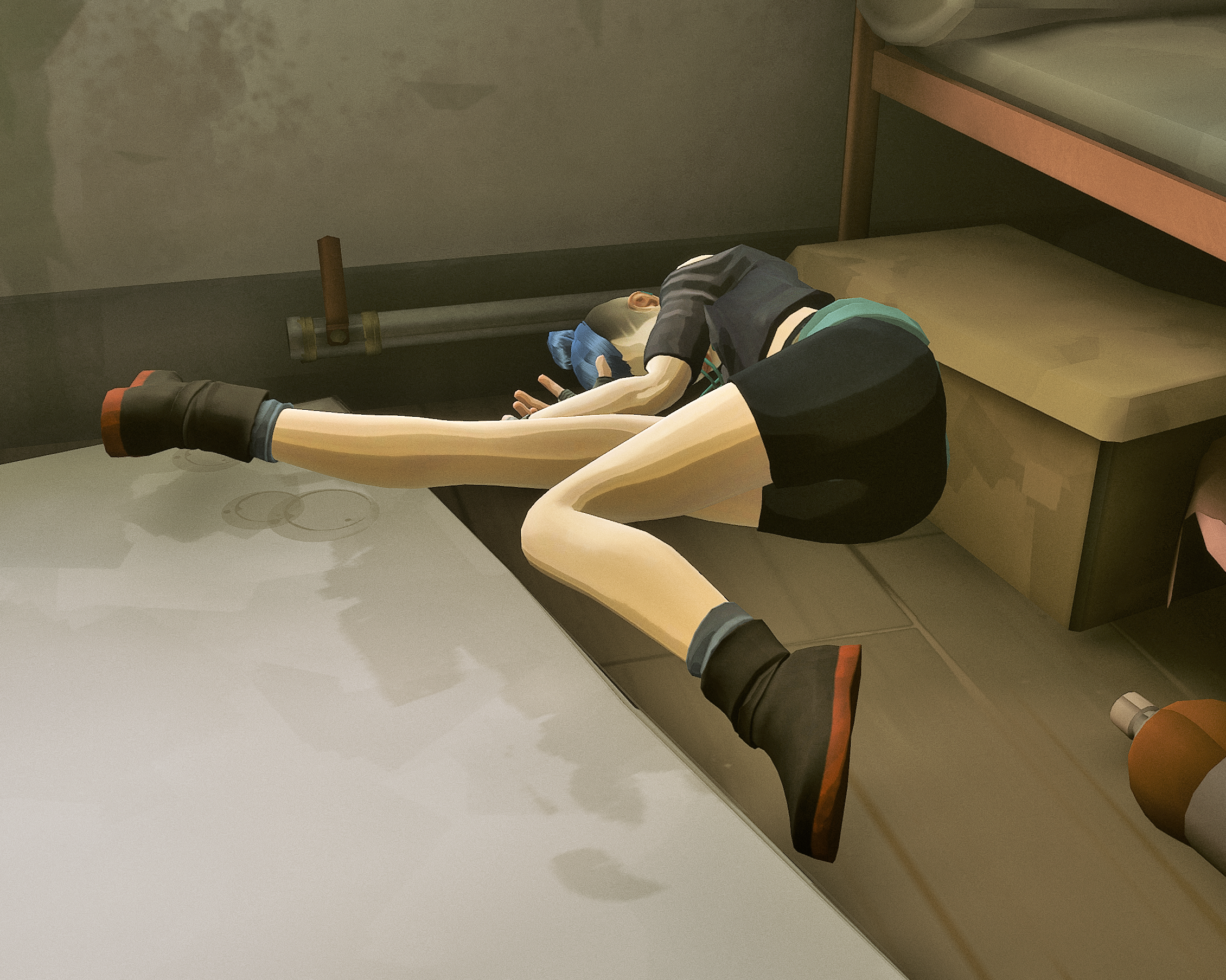 How did she end up there? Perhaps someone else already came through and tossed her on the mat, or perhaps she managed to drag herself there before losing consciousness. Regardless, late-arrival guy is not happy to see here there.