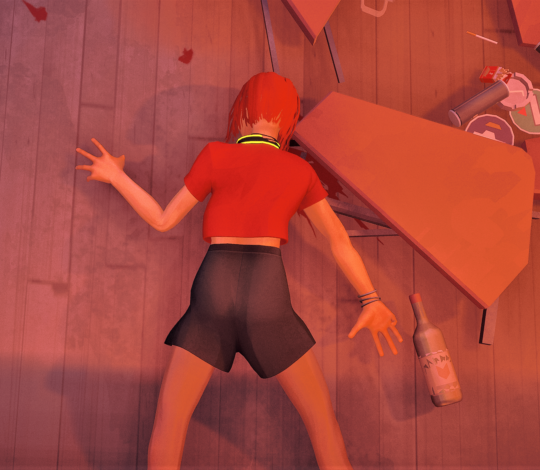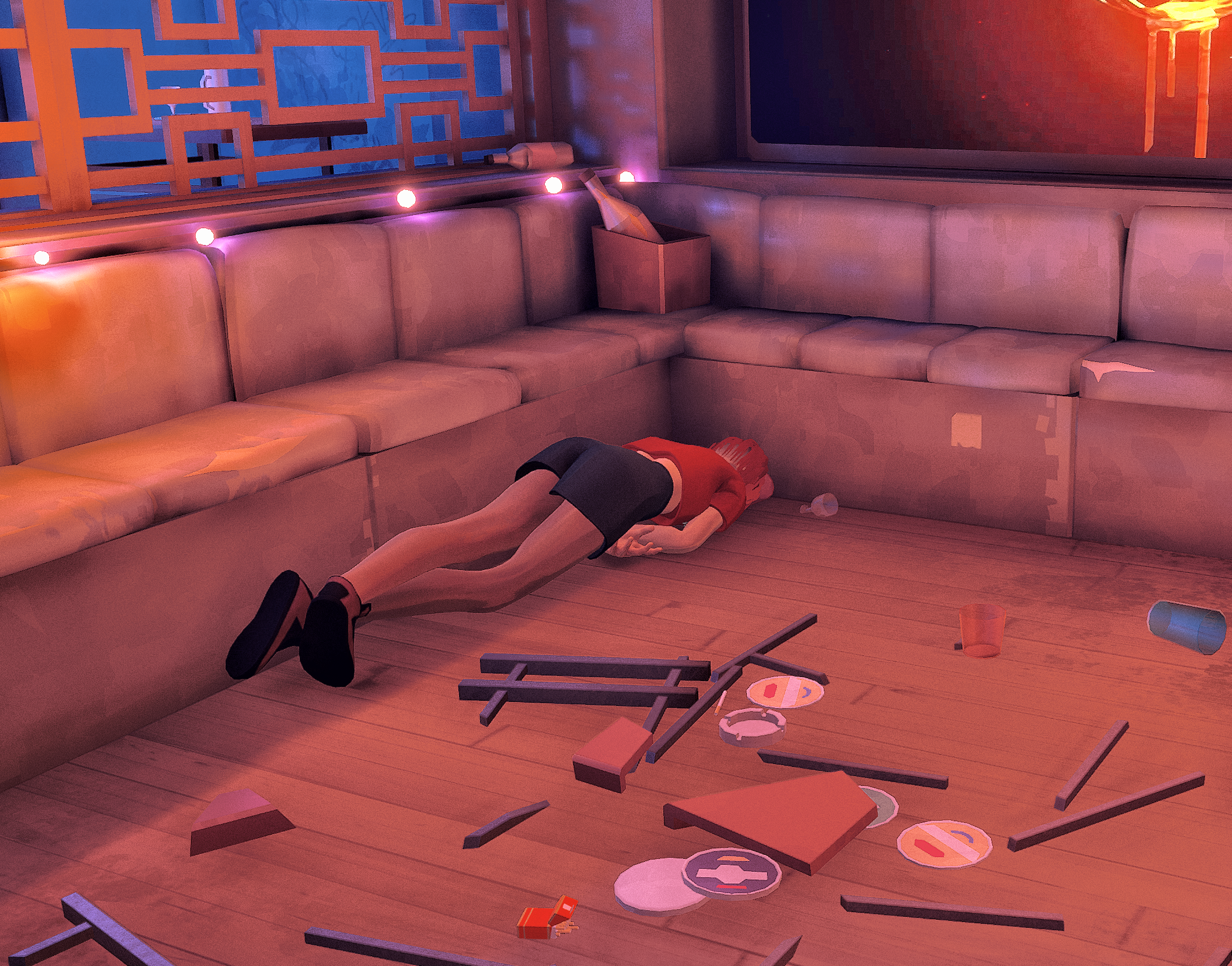 Sean: "We tell everyone that these losers picked a fight with us and this is the result. Everyone knows we're as much a fight club as a dance club, so after we took care of these idiots we just left them lying around. Our clientele will love it, and it will add some spice to the evening. You push her back in the corner there, and you get some paper and markers."