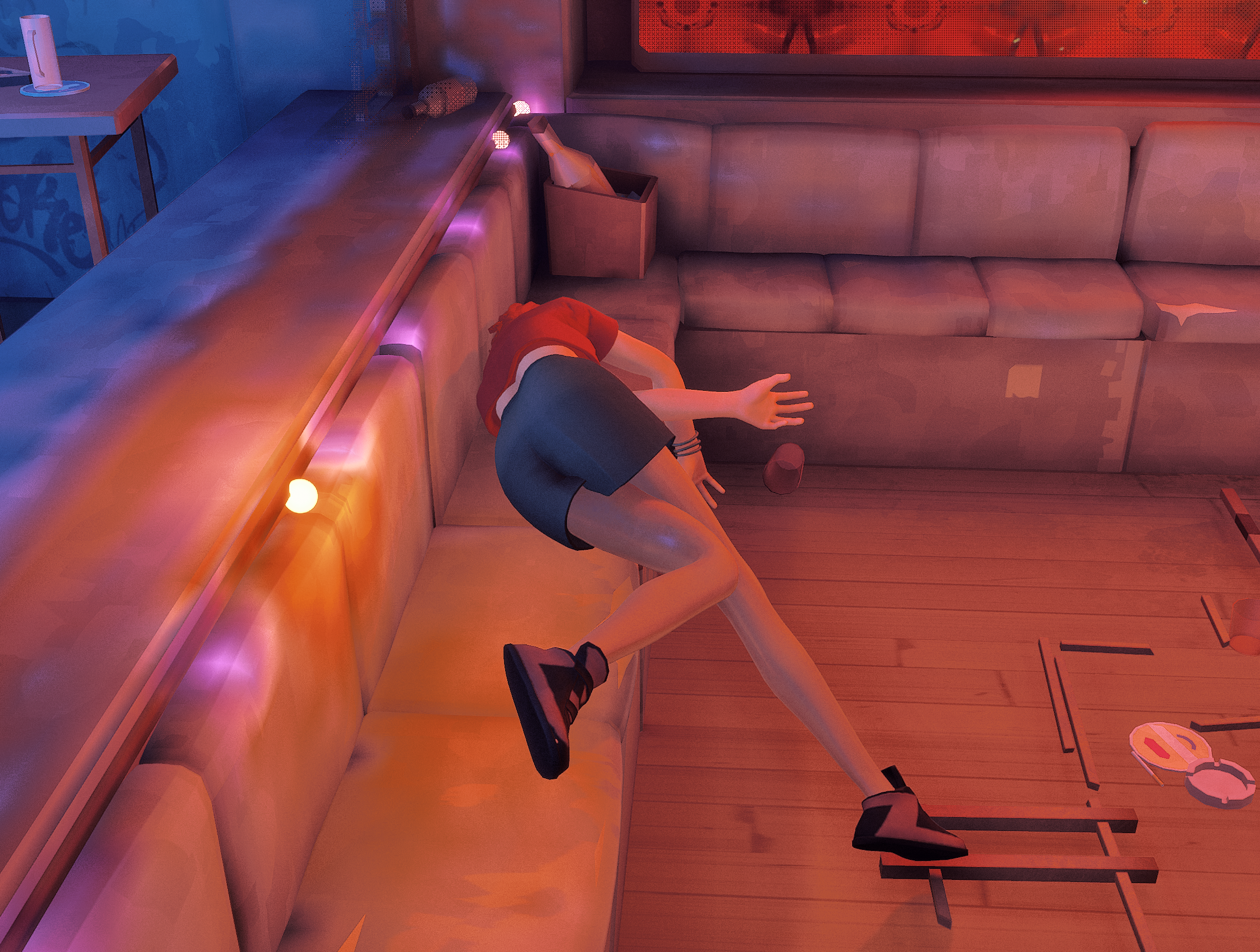 The hero can hit her with a vicious knee while she is stunned and helpless, and she flops back limply onto the same couch she was sitting on a moment earlier: