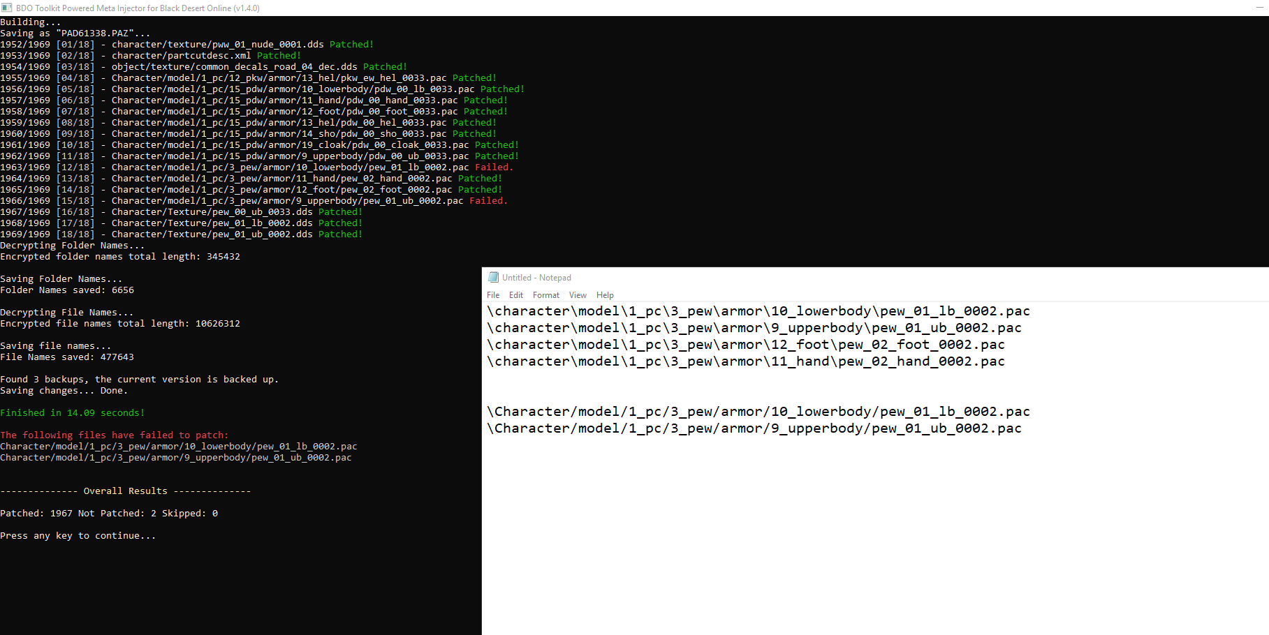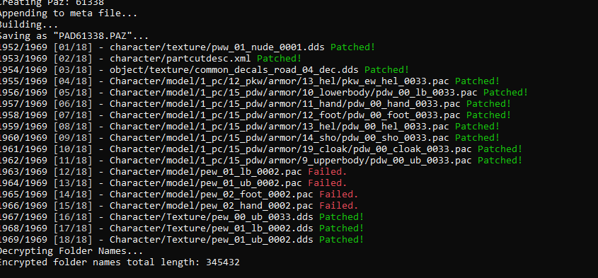 i patched the Dark Knight outfit perfectly and i took the exact same steps doing the Grunil Ranger armor but the patching failed. I'm placing all the pac's in the same folder as well as the textures and renaming