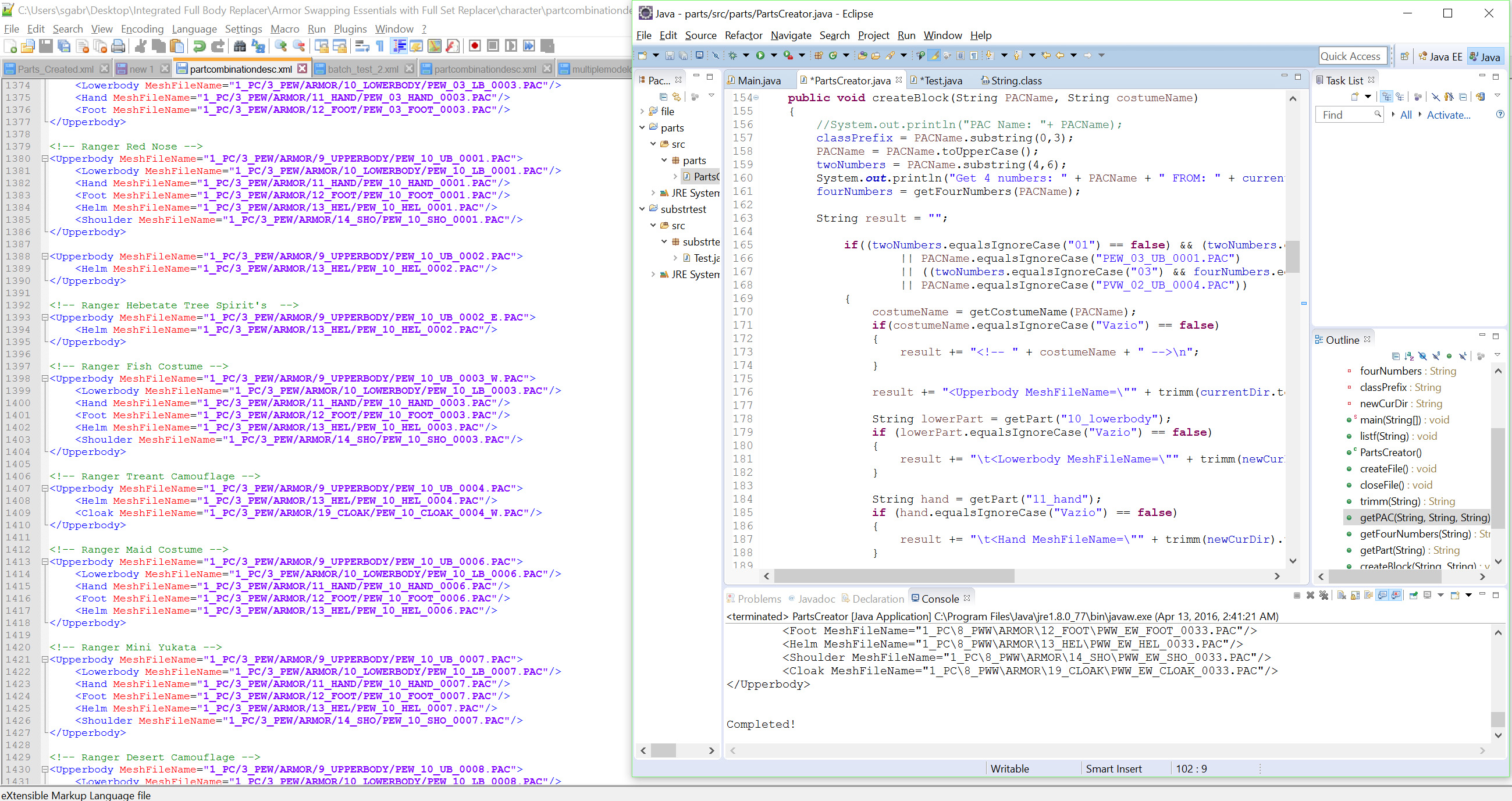 This way, it doesn't matter if the name of the cloak or the helmet varies (some of them have _w _s _c _a _op at the end, it's unpredictable), the program will always generate the right file names, and only the necessary ones (previously, it was only generating for the costumes that I posted in the fist page, and it was generating for all armor parts, even parts that didn't exist on that armor, but it didn't matter because the game ignores it if it doesn't find).