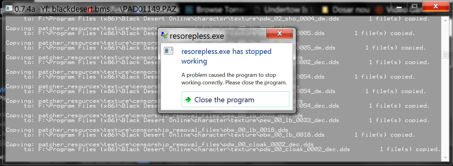 Send me your file "resorepless_patcher_state.bin" located in your "patcher_resources" folder here so I can try to find what's causing the problem.