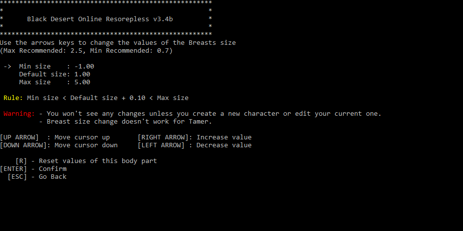 Changing the max body size values appears to have no effect, even when trying to create a character or editing a character I already have. Breast size, for example, remains the same regardless of the values. Is there something I am missing? I am not all that good with dealing with mods so that very well may be the case lol