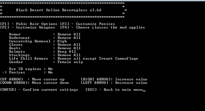 Warning: Every time you run resorepless.exe it will replace the your textures in your folder "Black Desert Online\character\texture\" which is where the game loads the file. So make sure you run "meta_injector.exe" after each time you re-apply resorepless.exe.