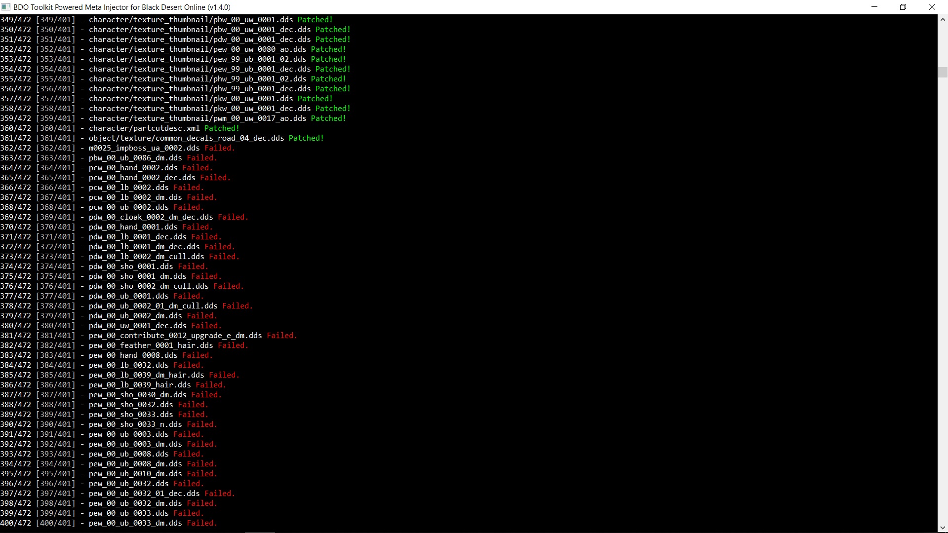 just follow steps on page one, i reinstalled bdo, then unzipped all the files, not folders to my paz folder then ... run toolkit once only .. you might have to hit option 3 to uninstall all then reinstall 1. then resor.. install let program do all the work mostly hit enter. when it injected use the patcher .. if your on steam add (spacebar)-idle at the end of the target in the shortcut you made on your desktop, if you didnt make one then do so now, right click patcher and send to desktop then edit properties of that shortcut > target needs to have (spacebar)-idle so it should say the path way then add a space and a - and the word idle .. what that does is when you launch the patcher before launching bdo on steam it will wait for you to launch it on steam.