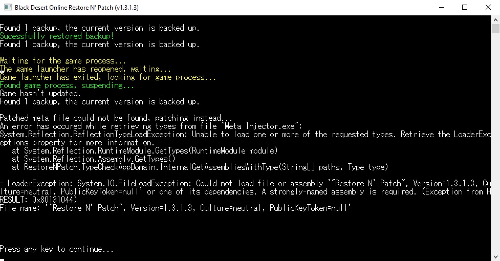 10. Run BDO Launcher, login, start game, got the error image from Restore N' Patch.