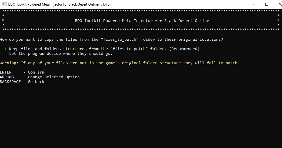 As you said, during installation process in meta injector the mod presents the two options: "keep file and folder structures" and "let the program decide", but I can't choose between them, because the first one is in red and the second in green and preceded by an arrow. And it seems to me that I can't choose between them, because the interface said: "Press any key to continue", and when I press "up arrow", to change my choice, the program run, and I suppose it's doing by the second option: "let the program decide". It is just a speculation.