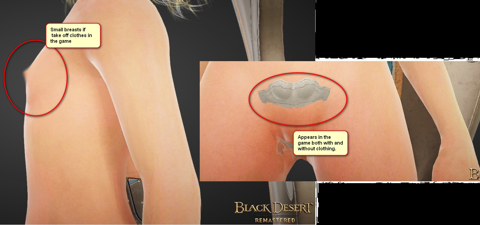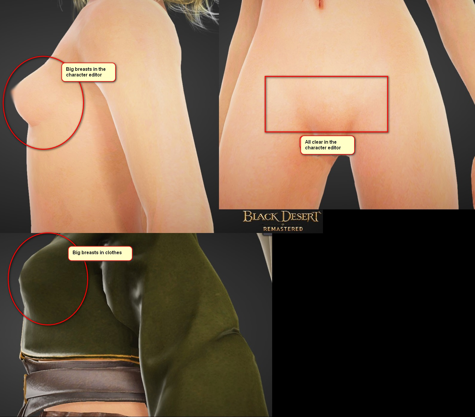 Good day. I need help for 2 questions. Can any say why in character editor and with clothes in game Shai have big breasts, but without clothes in game the breasts is small (pic1, pic2)? And how I can remove texture at the bottom, this appears in game with and without clothes (pic.2)?