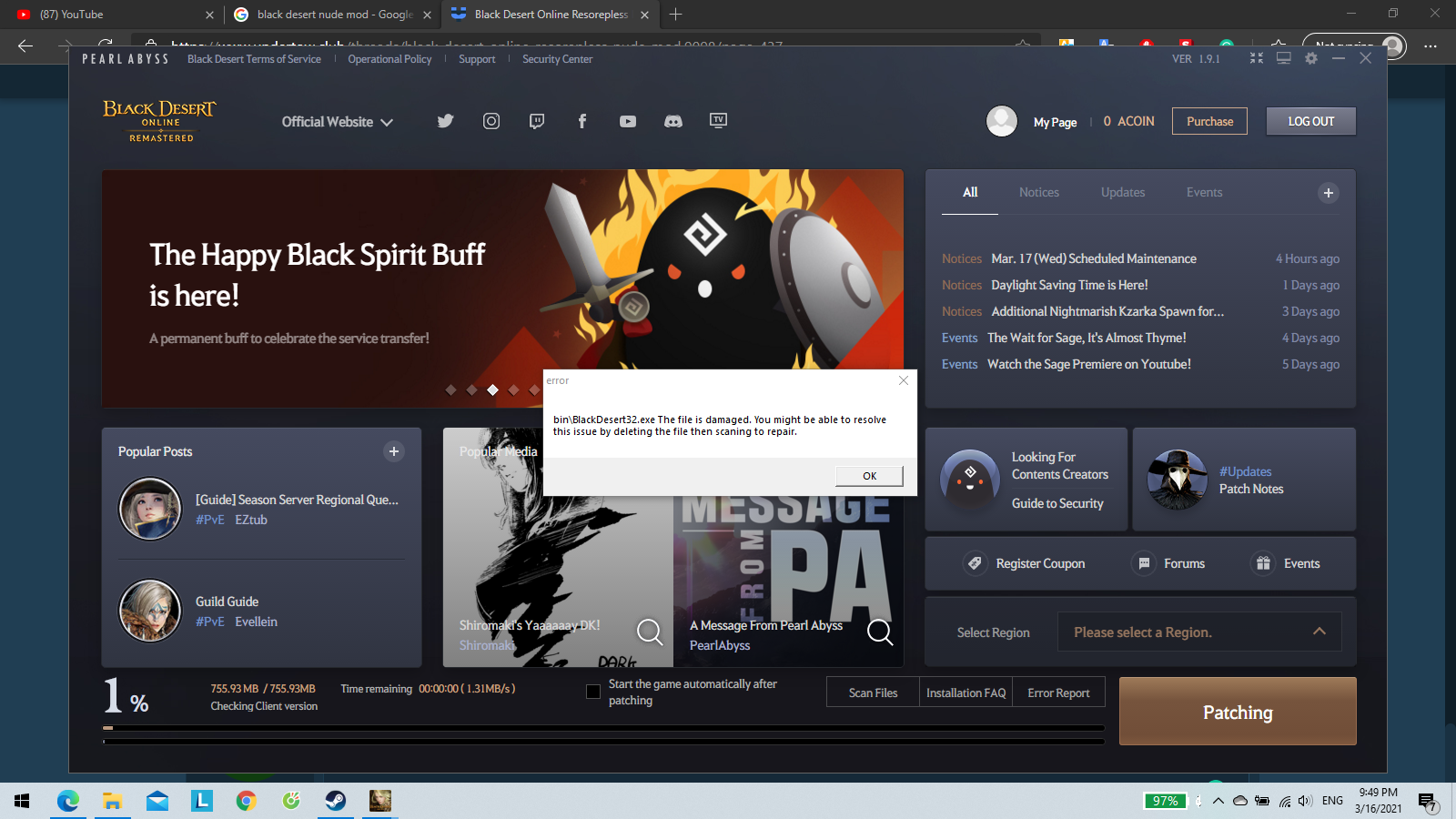 - Game up to date (+pearlabyss launcher), run mod and patch files, try the game corrupted files detected.