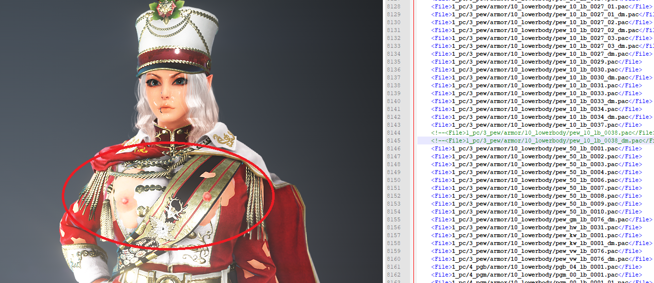 For example:Here:<!-- <File>1_pc/3_pew/armor/38_underwear/pew_00_uw_0020.pac</File> <File>1_pc/3_pew/armor/38_underwear/pew_00_uw_0020_01.pac</File> -->