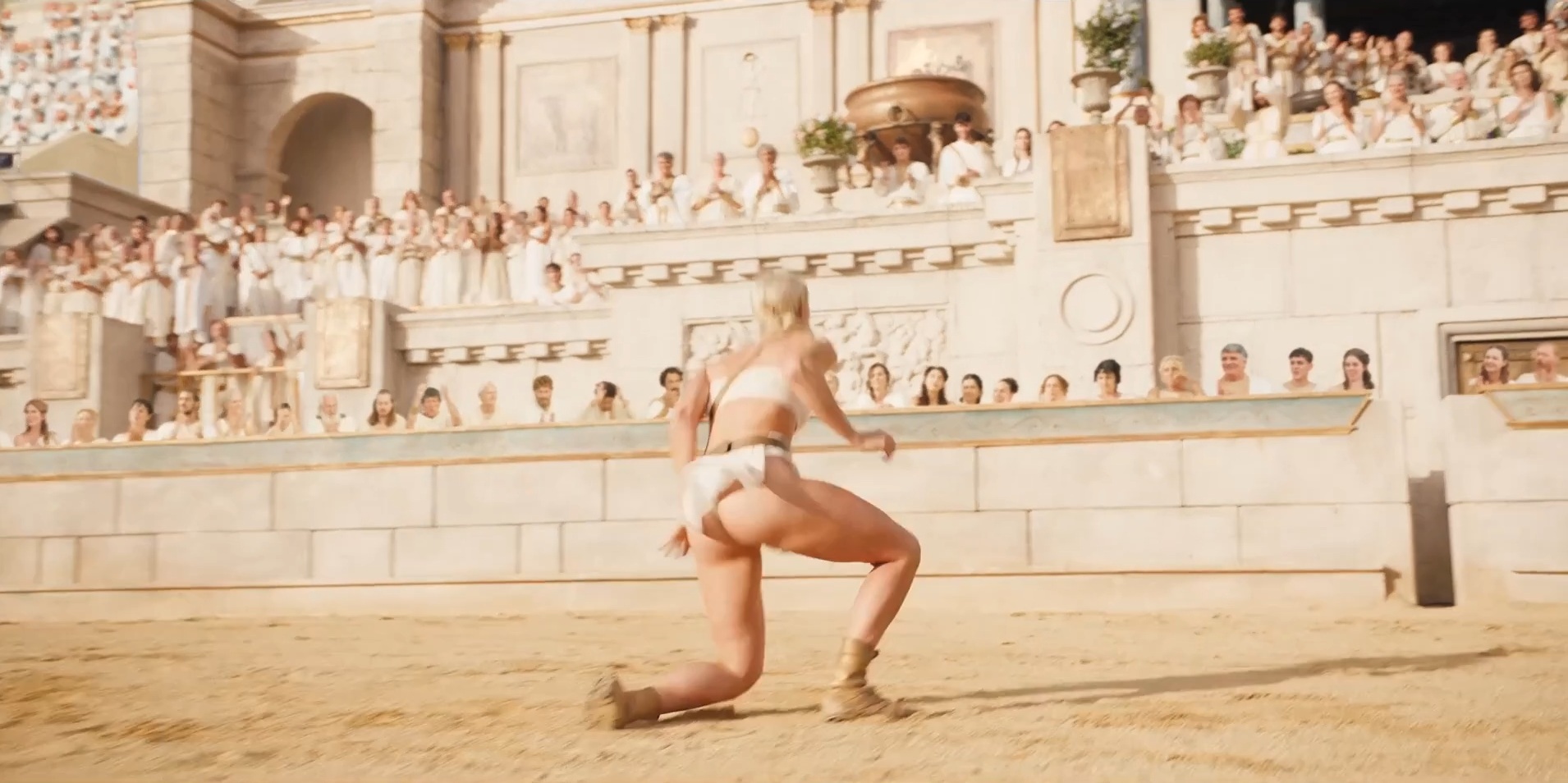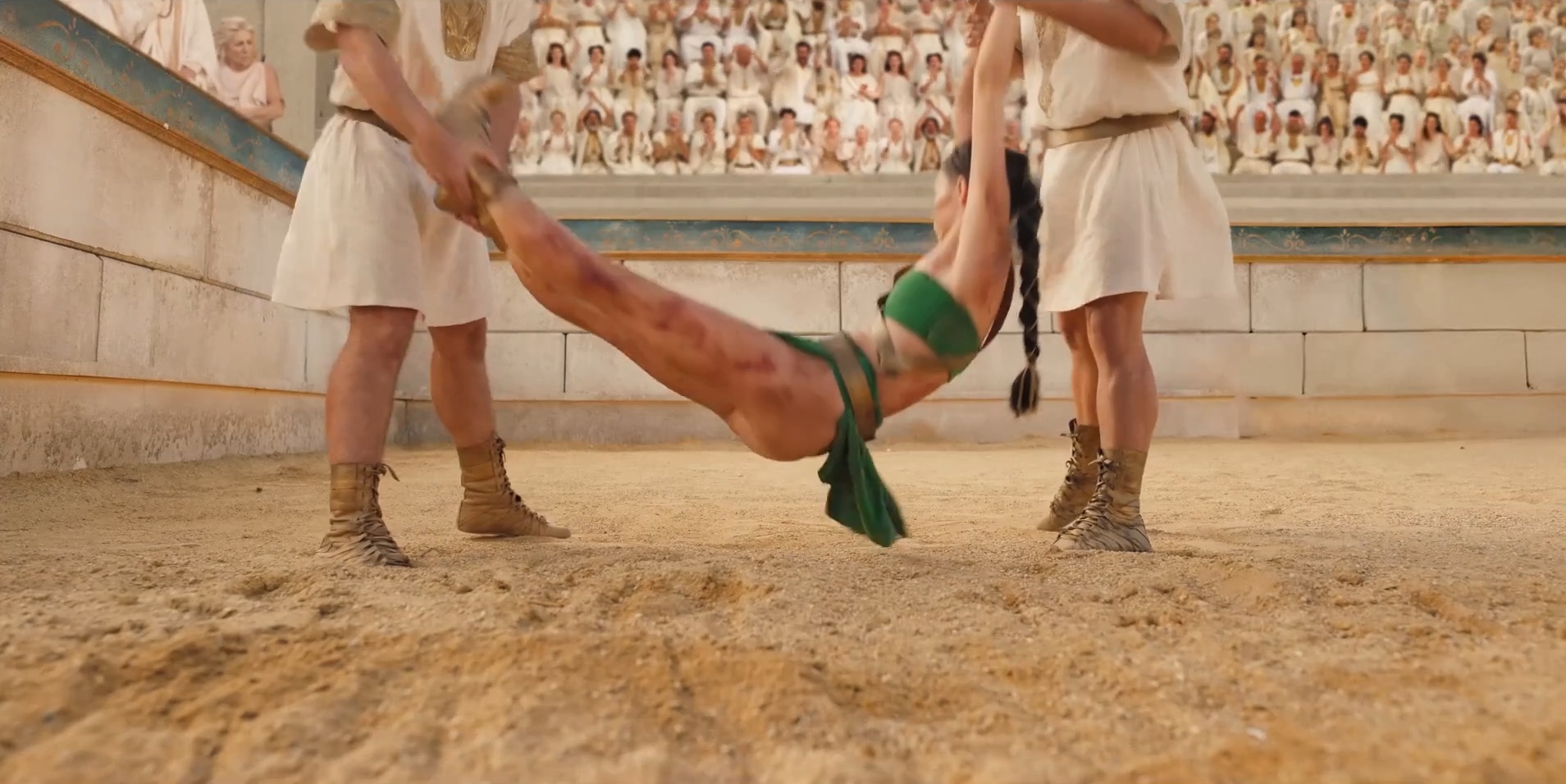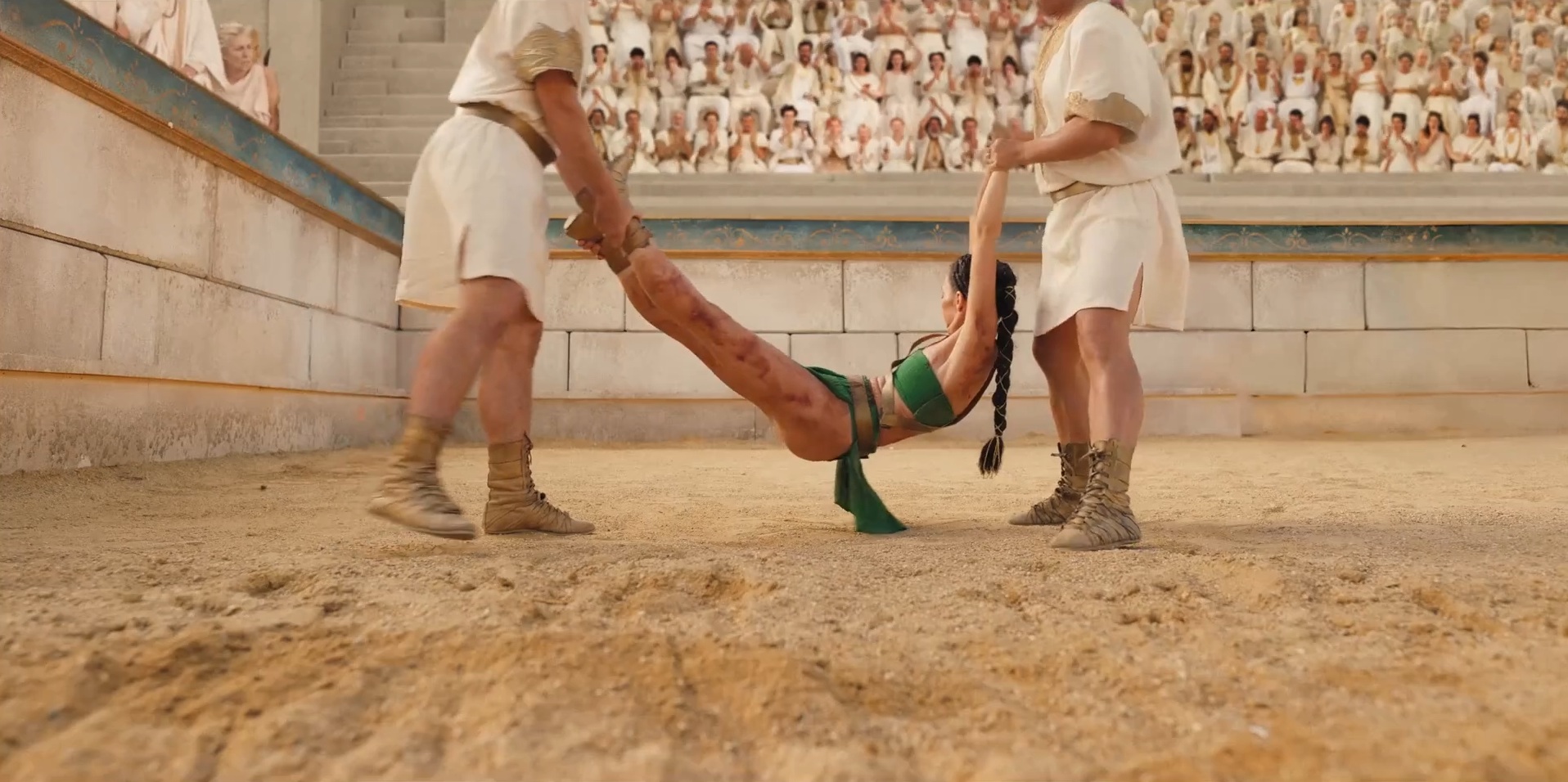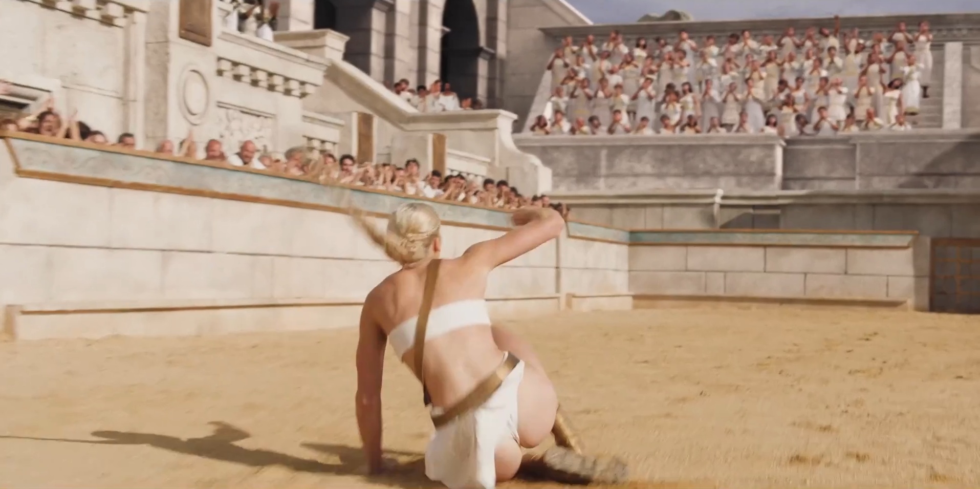 There is a gladiator fight in the ep1. A man and a woman try to kill a bull. The fight is very quick, but it focuses mainly on the woman and ends with a scene of her dead body being carried and thrown away.