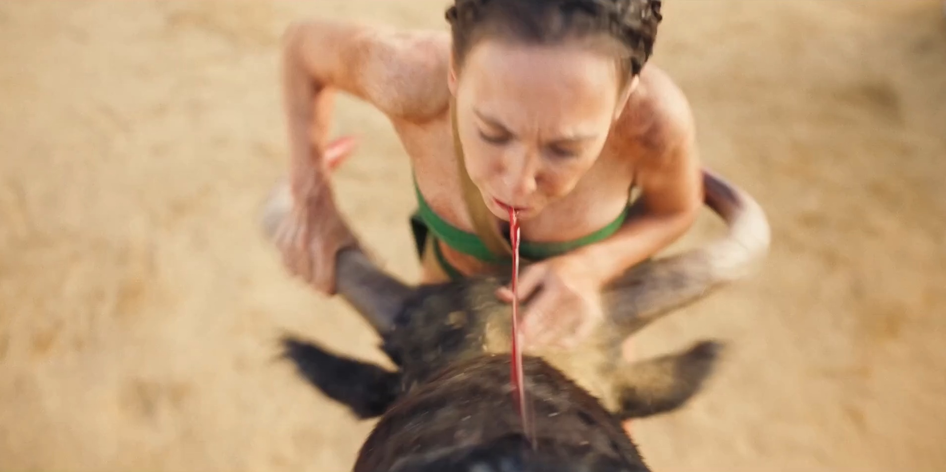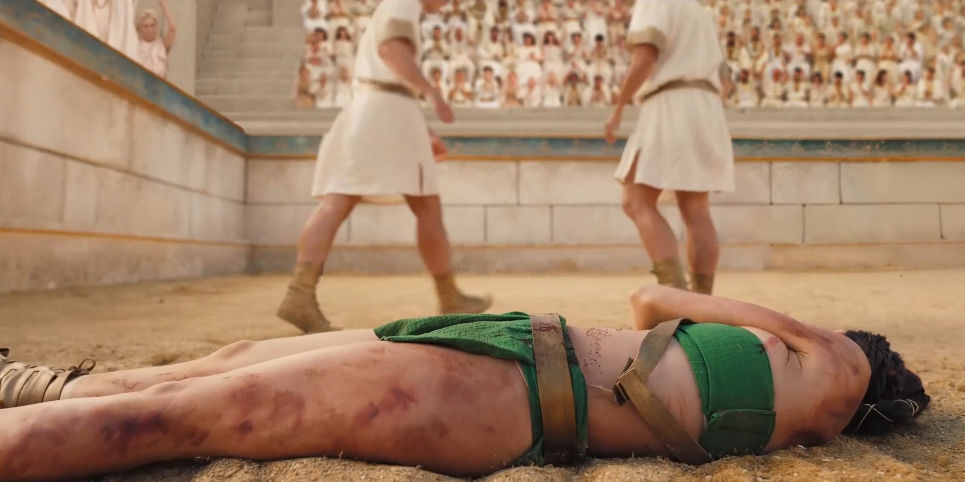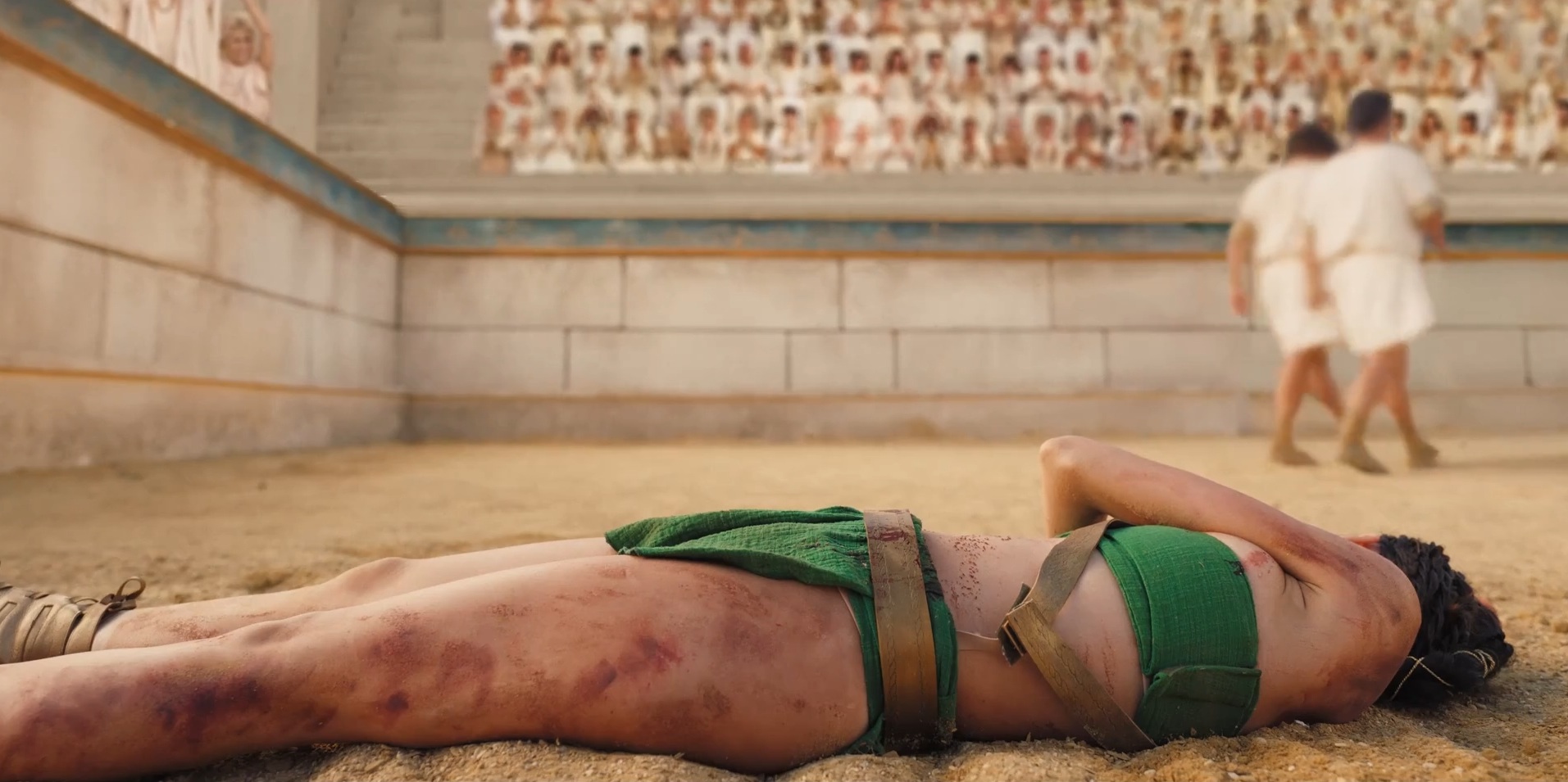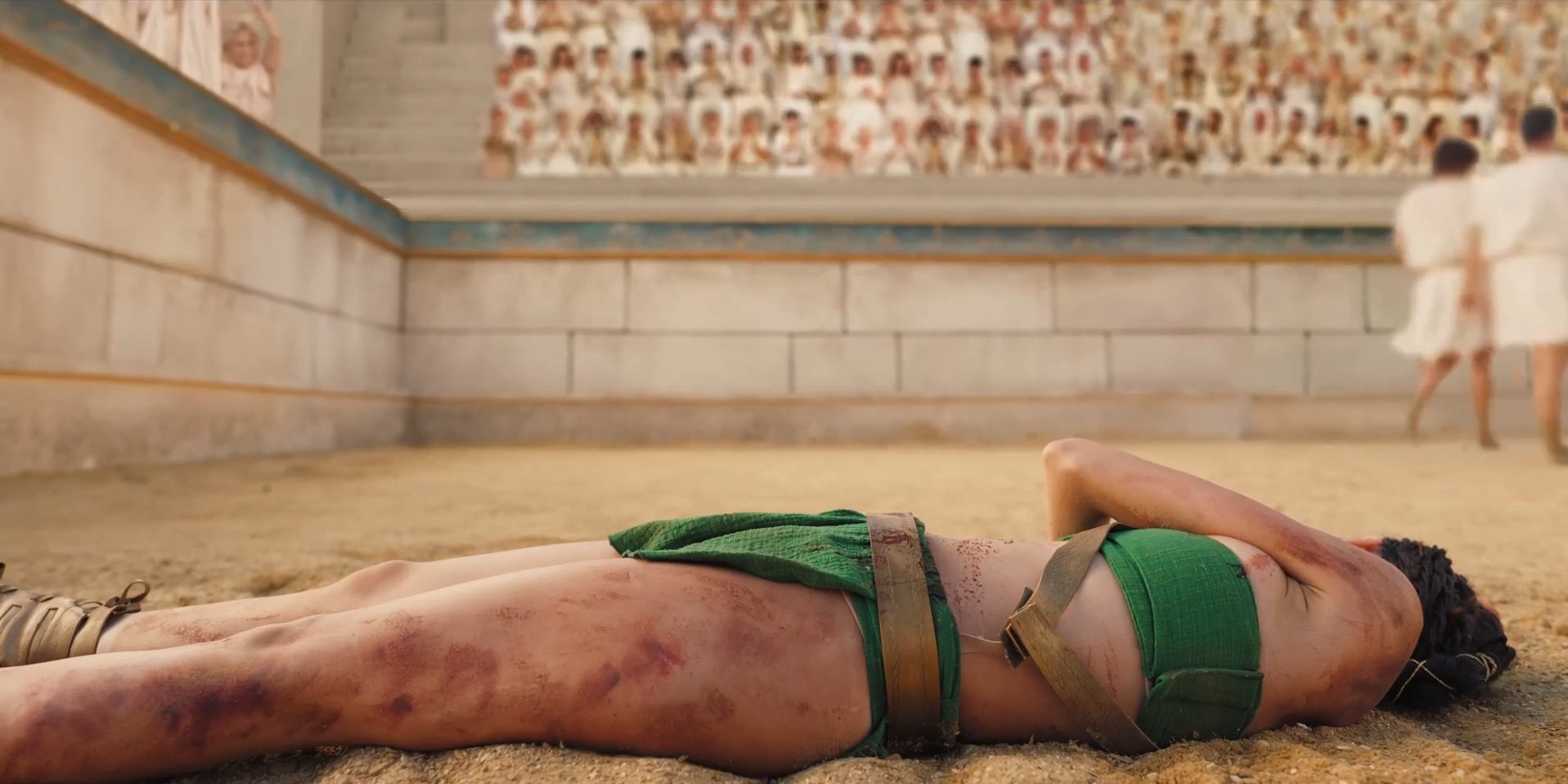 There is a gladiator fight in the ep1. A man and a woman try to kill a bull. The fight is very quick, but it focuses mainly on the woman and ends with a scene of her dead body being carried and thrown away.