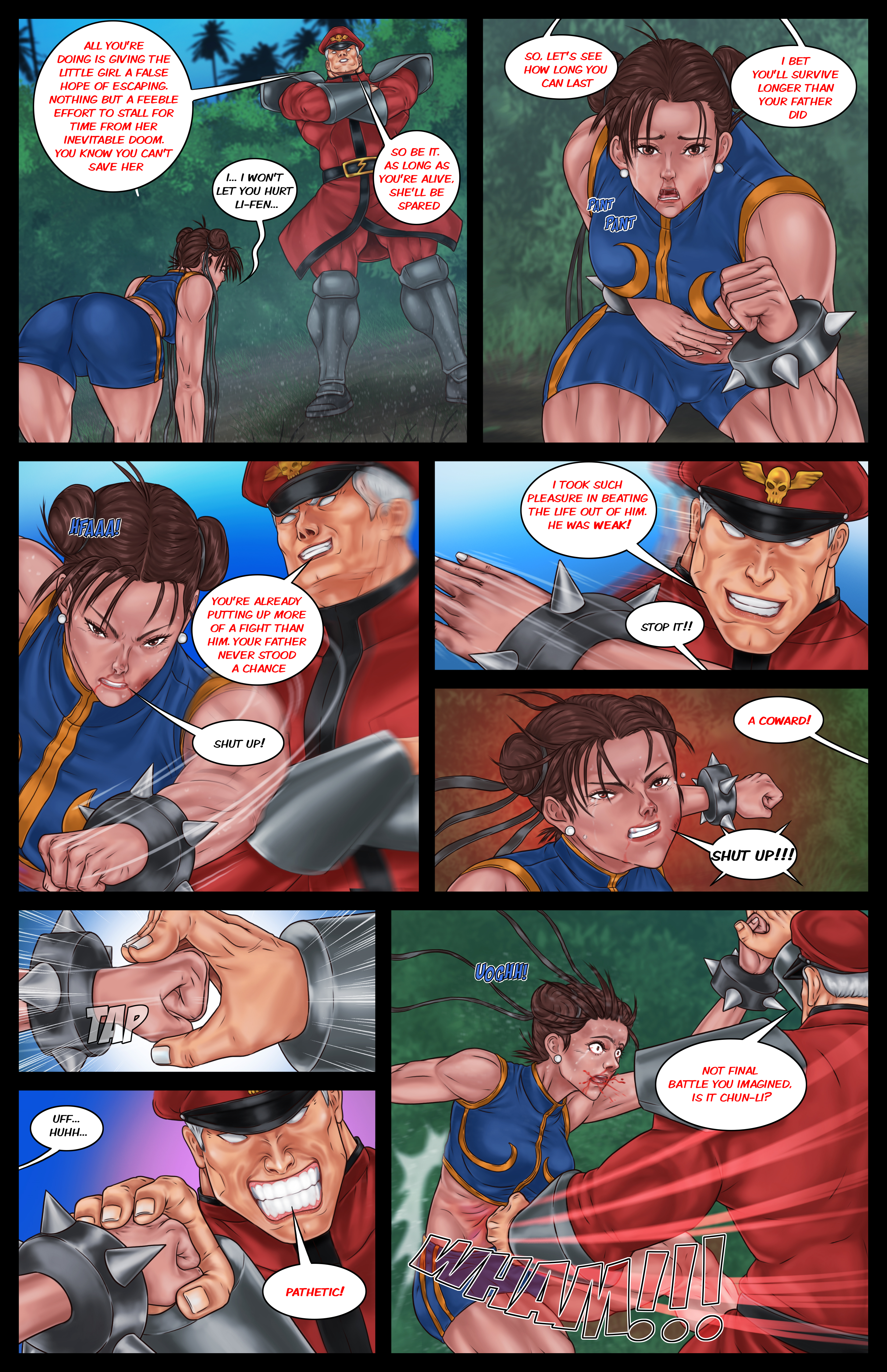 This is a single commission piece we did a couple months back in which Chun-Li takes on Shadaloo's money loving thug, Balrog. In this scene, Balrog and Chun-li are fighting. Balrog delivers a devastating punch to Chun-Li's stomach that pound her into the wall. The powerful punch knocks the wind (and possibly whatever lunch she had earlier) out of her. Chun-li's expression says it all.
