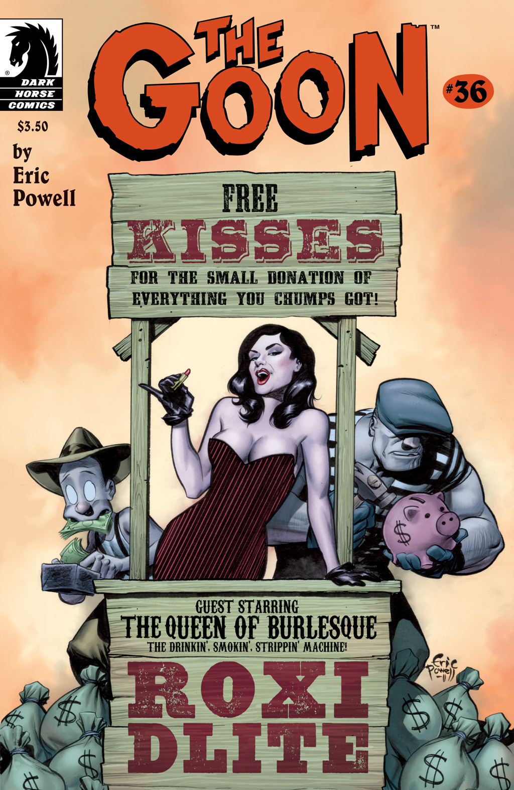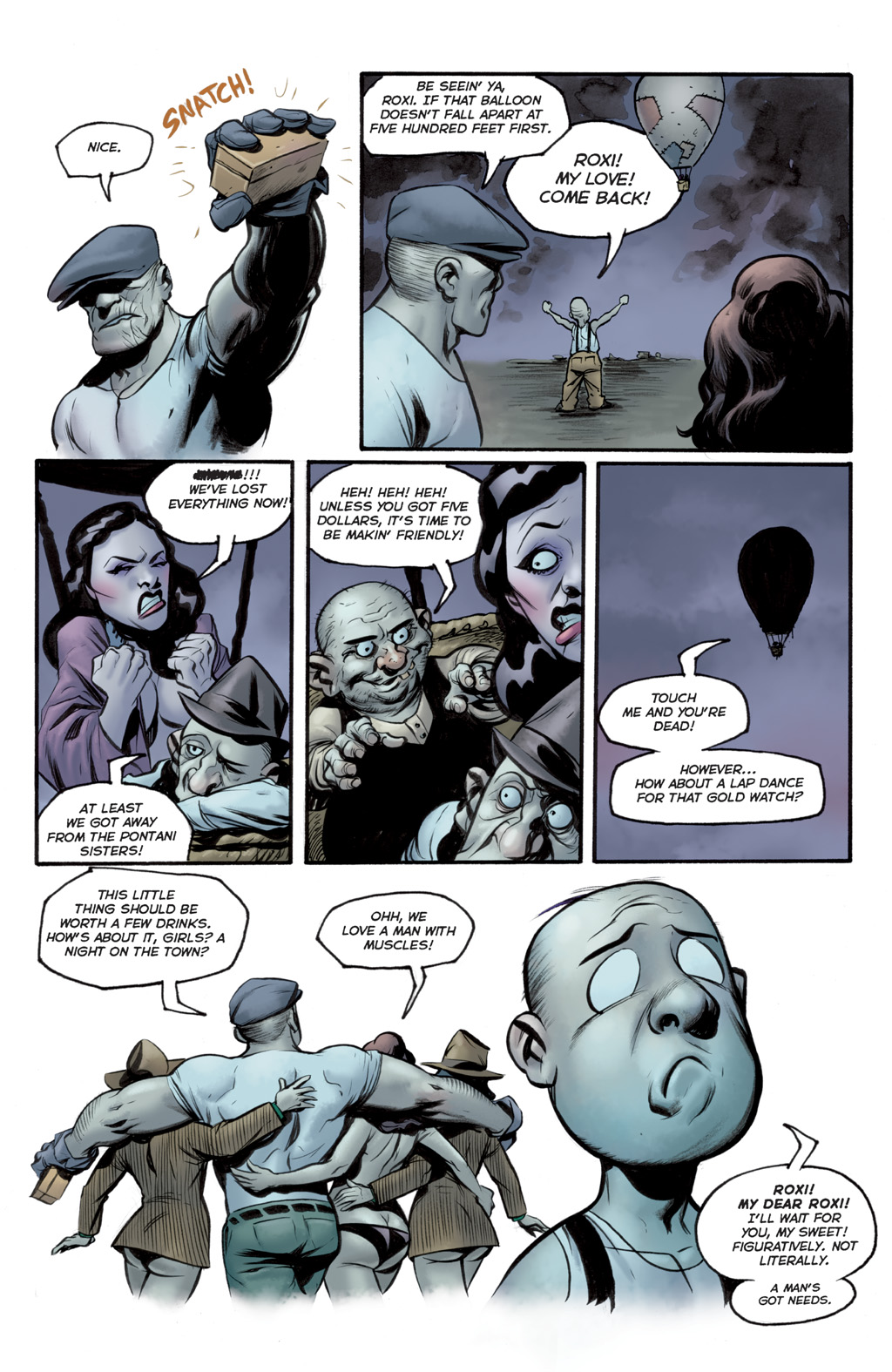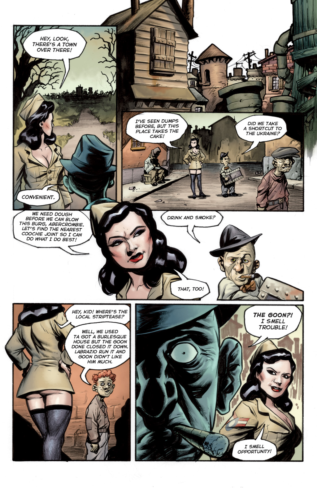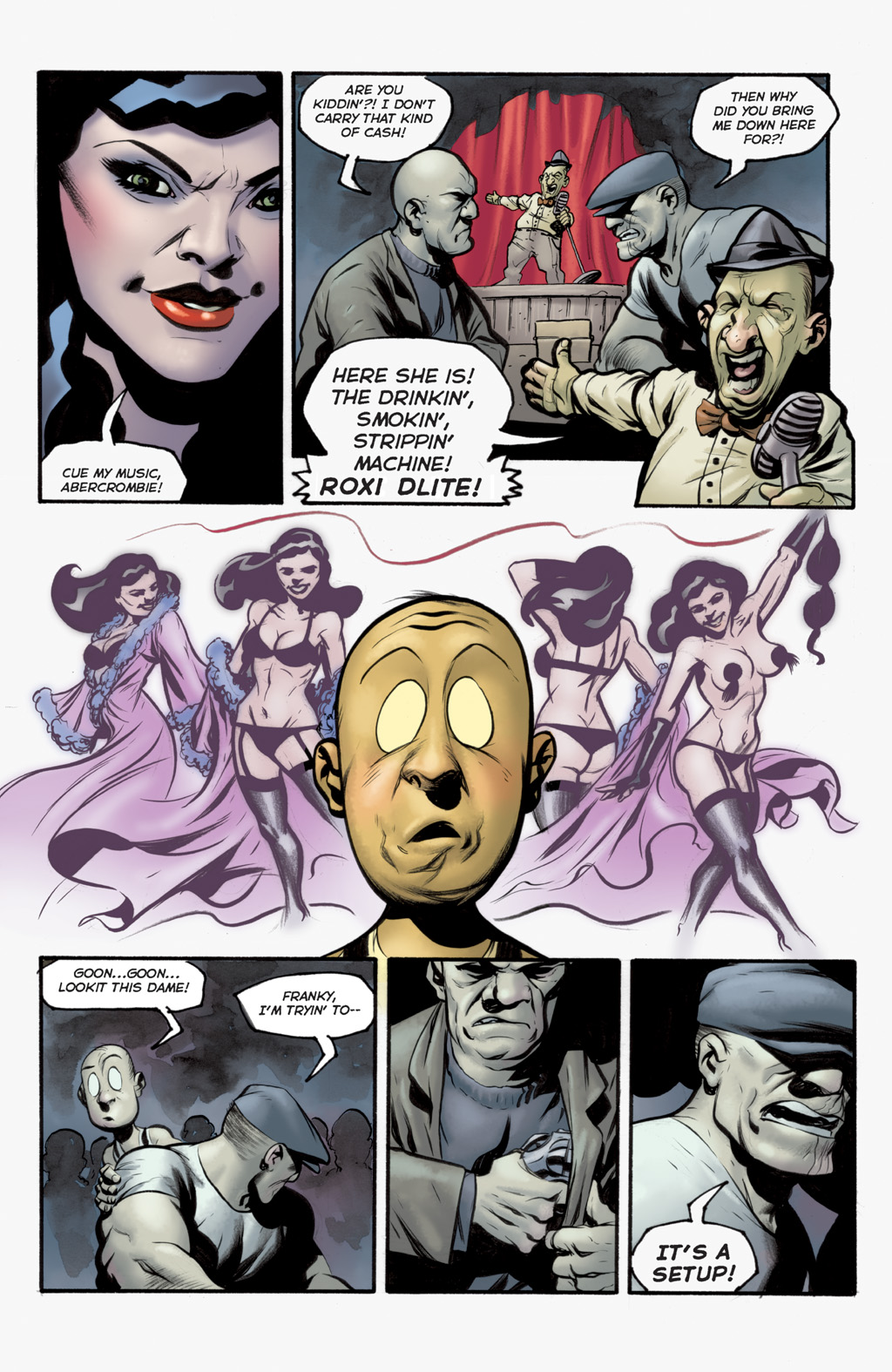 Roxi DLite - queen of Burleque. A con-woman, seductress and murderer who comes to town, she takes over the burlesque (and totally has hot lesbian sex with the harpies) before robbing the Goon. She gets off with a hot-air baloon in the end, though without the necklace. She seems to like running around without wearing much... especially not bras. :D
