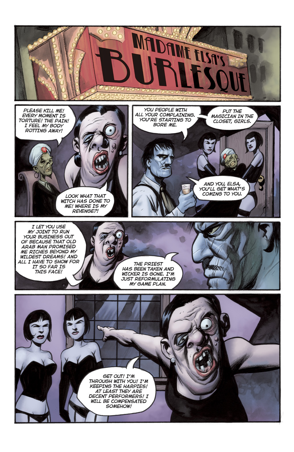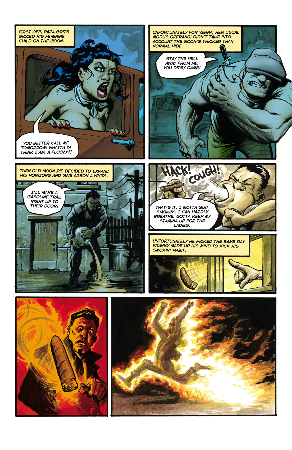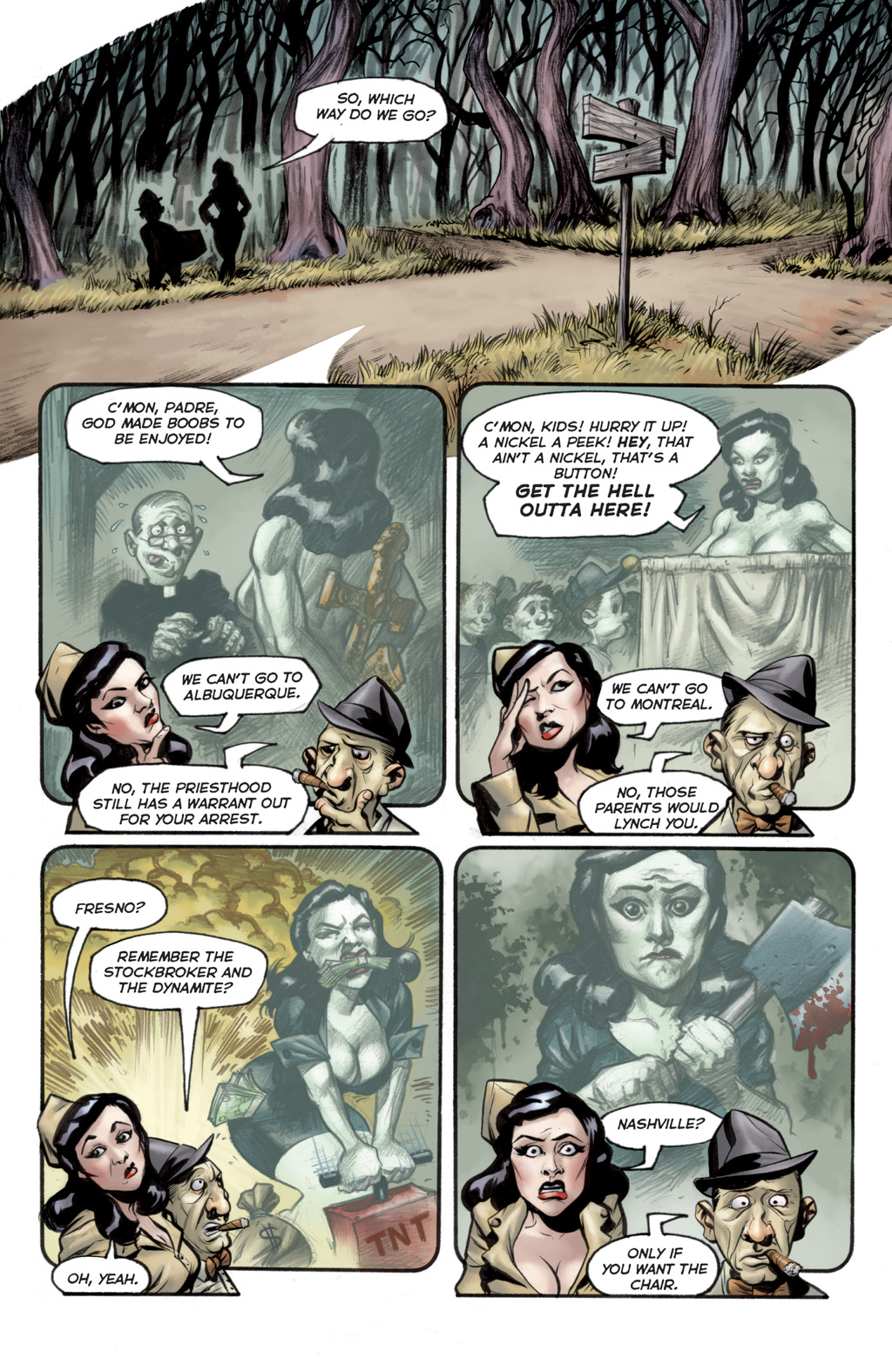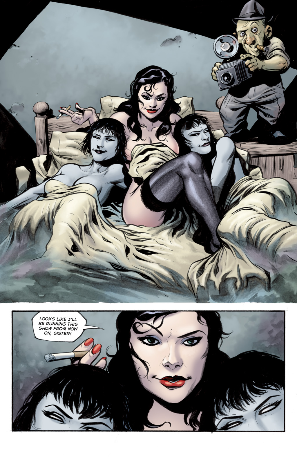 Roxi DLite - queen of Burleque. A con-woman, seductress and murderer who comes to town, she takes over the burlesque (and totally has hot lesbian sex with the harpies) before robbing the Goon. She gets off with a hot-air baloon in the end, though without the necklace. She seems to like running around without wearing much... especially not bras. :D