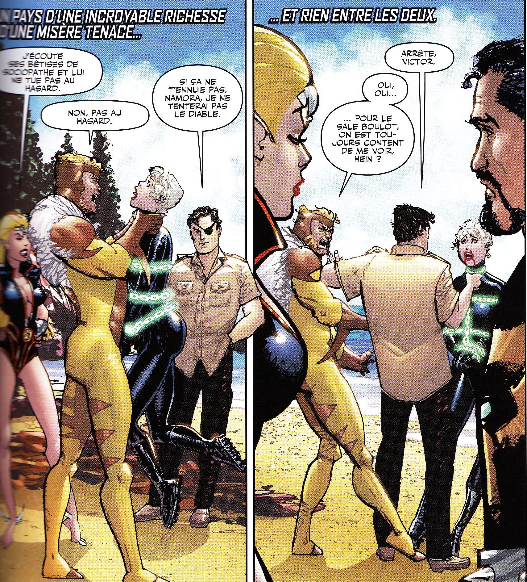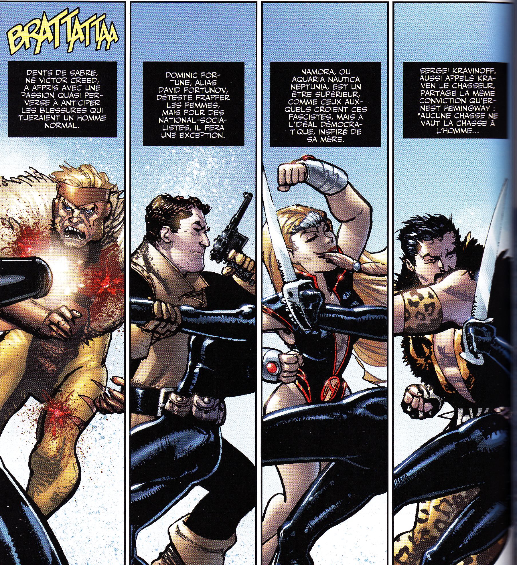 Is that Nick Fury, before he got "blackwashed"? I recognize him, Kraven and Sabertooth, not sure who the girl is - Titania maybe? Odd Avengers story, as these people are usually known to be villains.