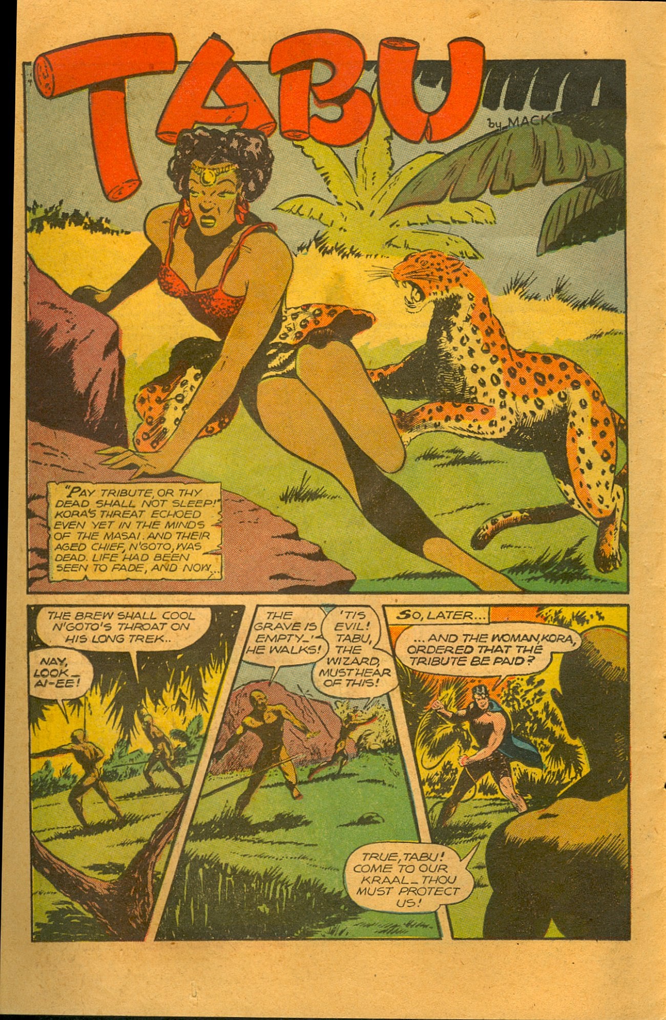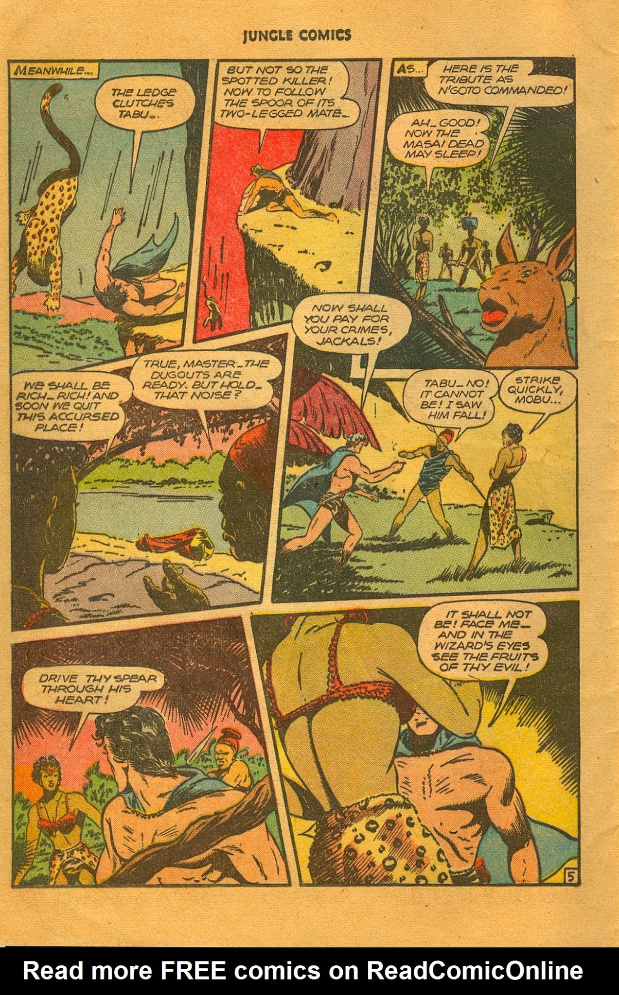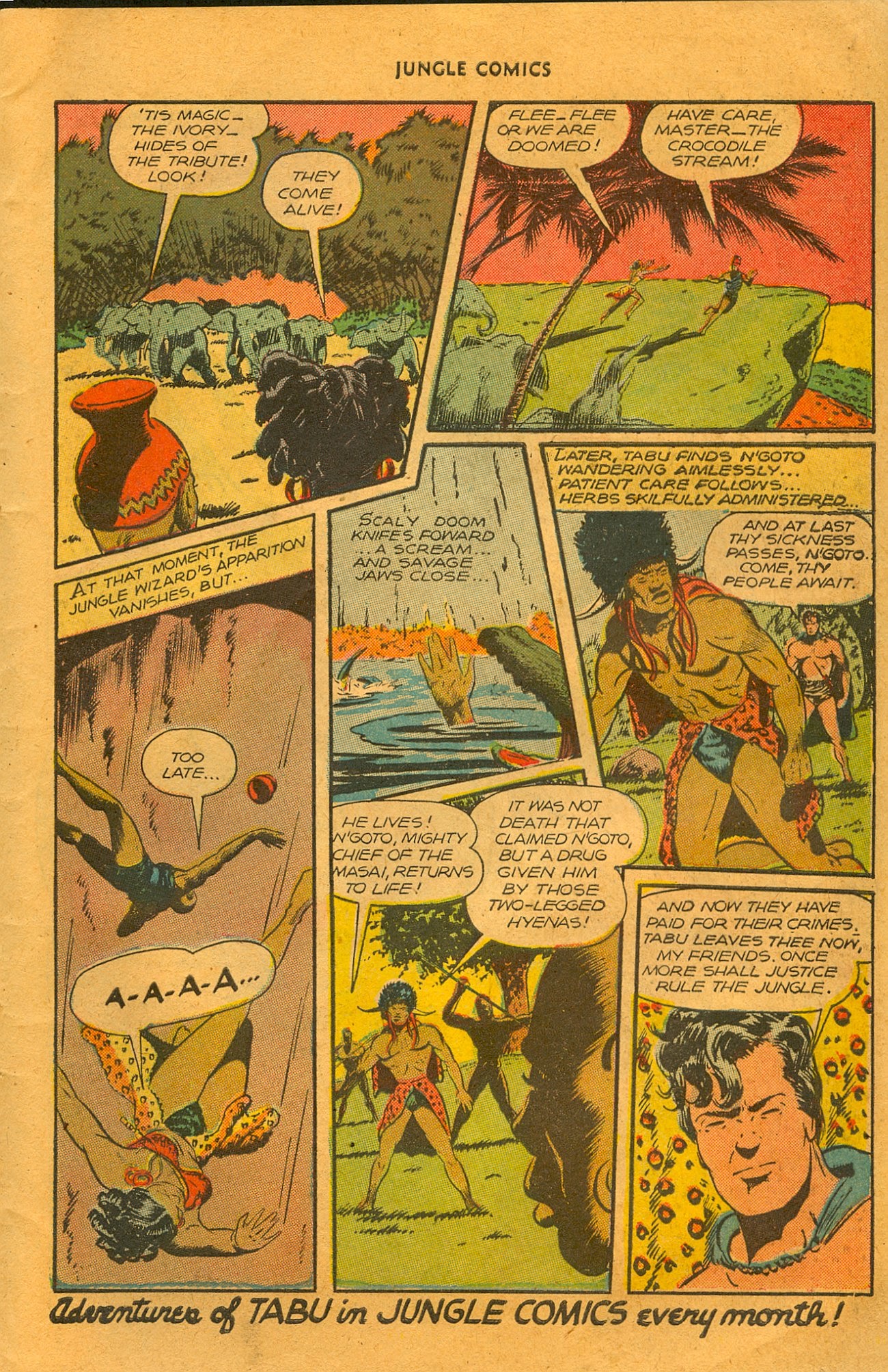 Sexy black traitorous tribeswoman betrays the hero to take the tribe's gold, but gets tricked by illusory elephant stampede and falls into a river with crocodiles. (From Jungle Comics - Tabu)