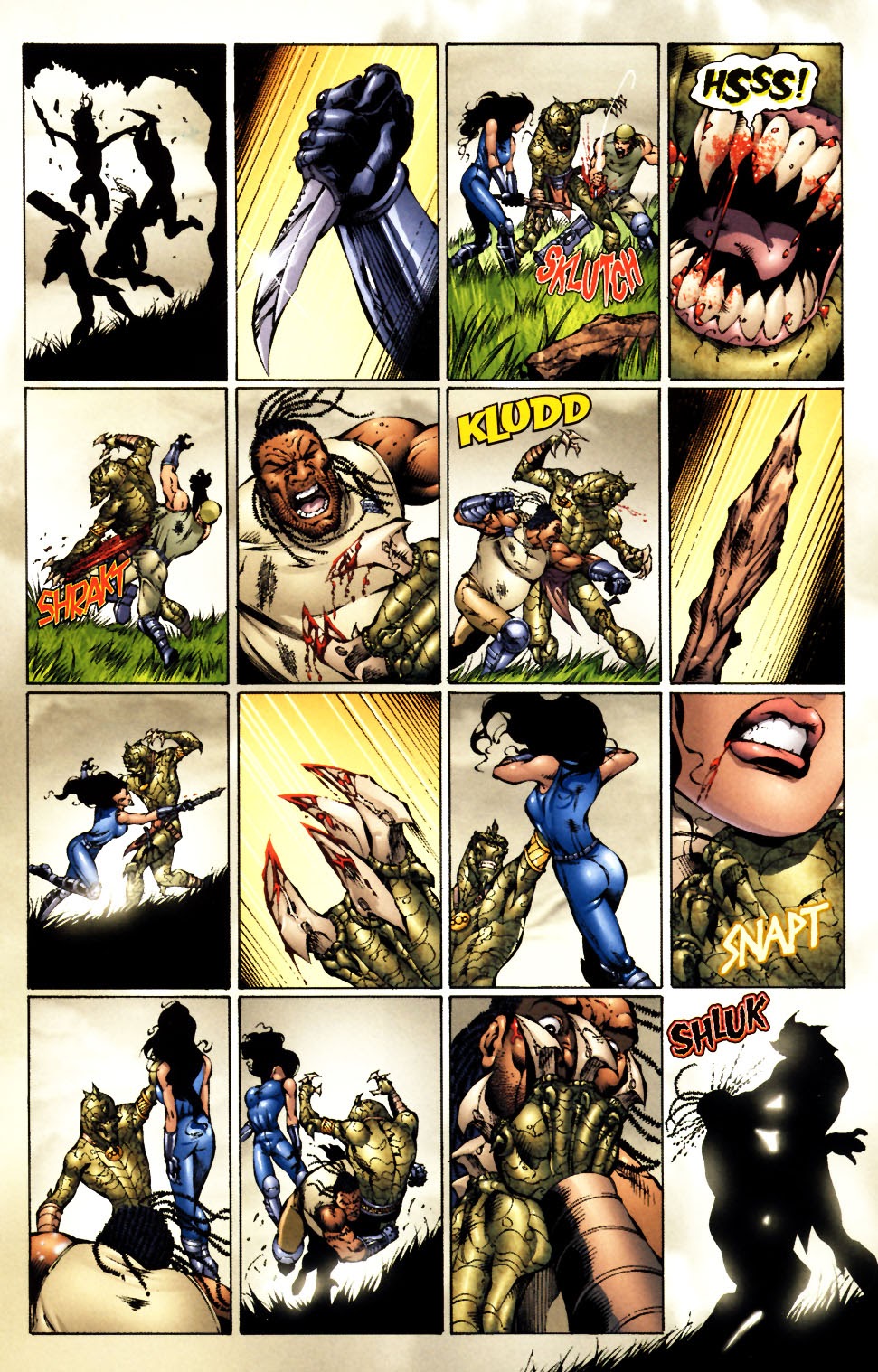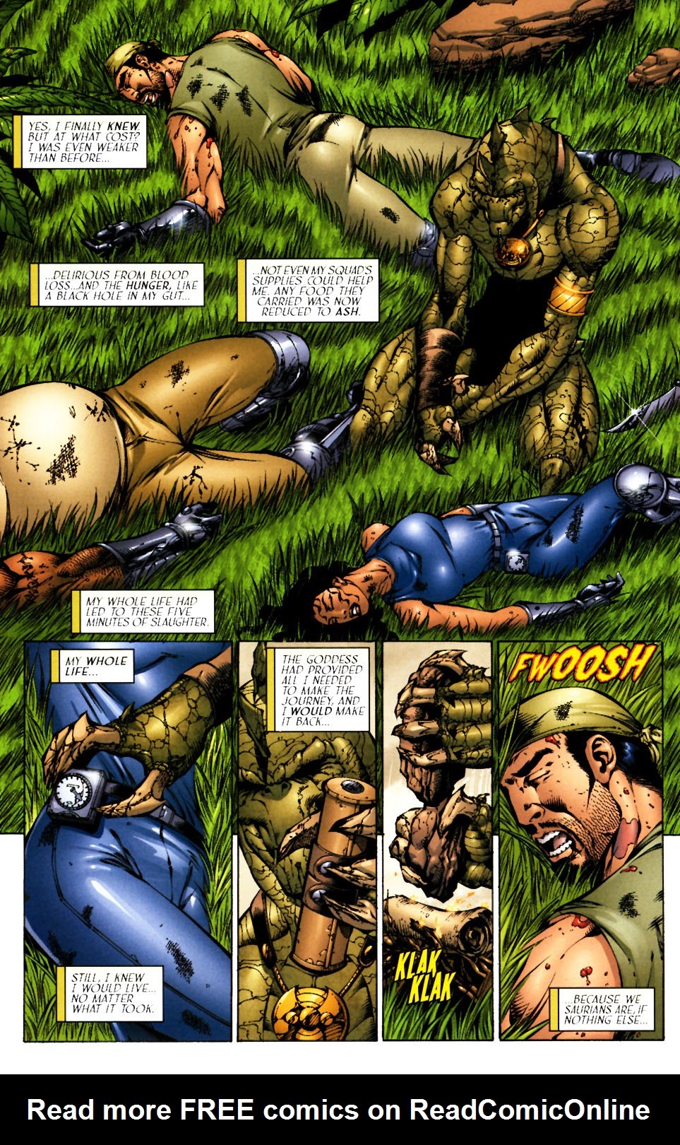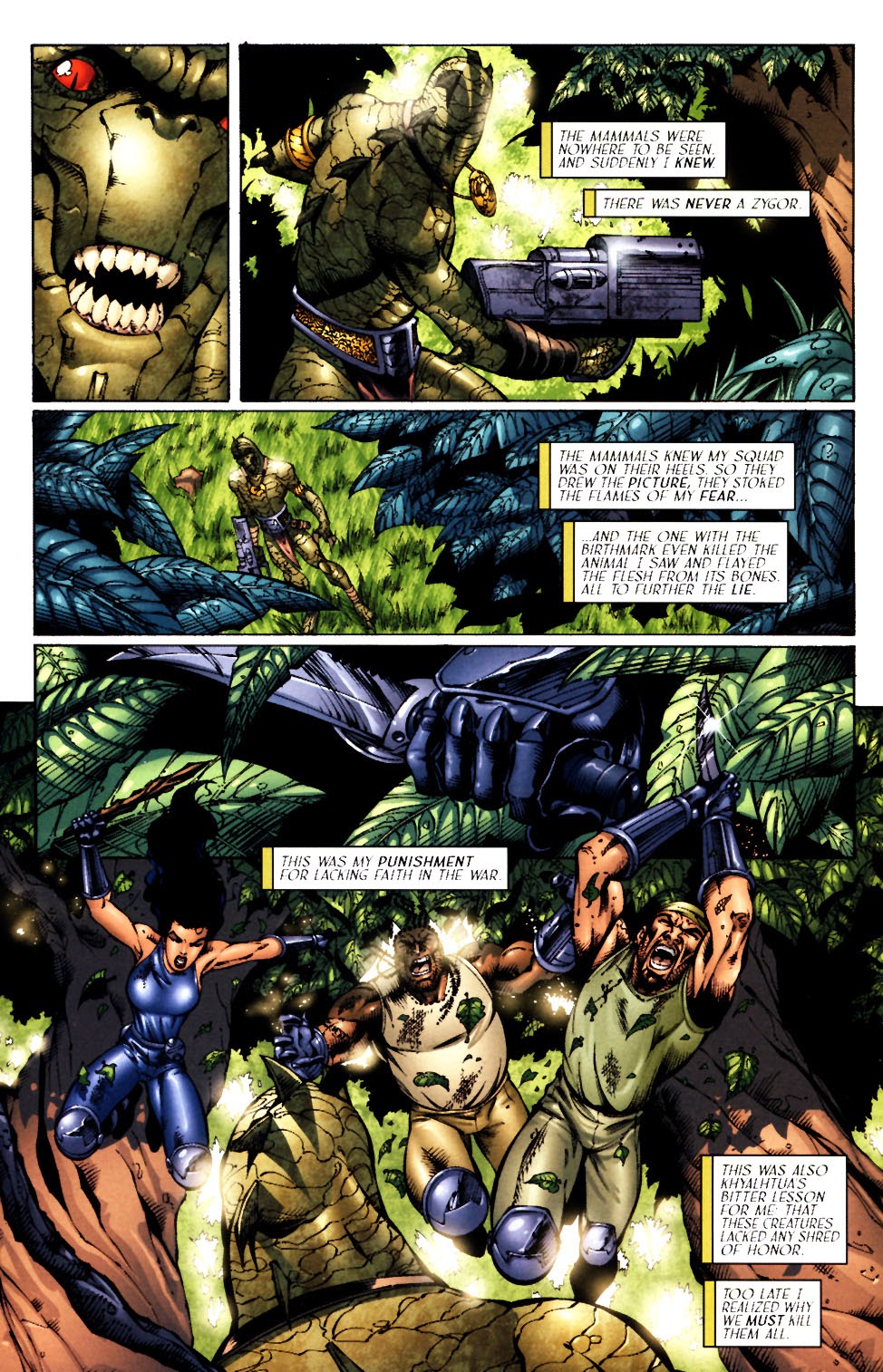 I forgot what comic this was from... Some reptilian alien species is fighting a war with humans, and we are actually the bad guys. Sexy soldier gal gets killed by the main character.
